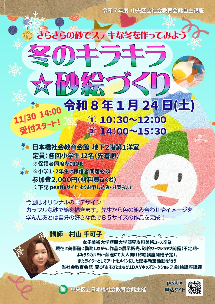 ●2026年1月24日、日本橋社会教育会館にて「冬のキラキラ砂絵づくり☆」砂絵ワークショップ開催