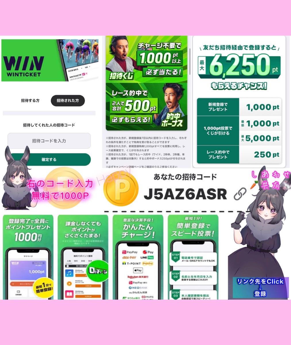 友だち招待経由で登録するとチャージ不要で2,000pt以上必ずもらえる❗️ 1等を引けばなんと最大6,250pt❗️ 登録後「J5AZ6ASR」入力&1,000円分無料投票をして、くじをひこう🉐Q.個人情報はバレない?