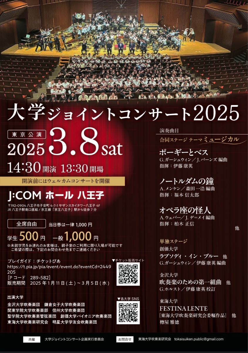 大学ジョイントコンサート2025 東京公演 日時:3月8日(土) 開演14:30 (開場13:30) 会場:J:COMホール八王子 (JR八王子駅南口直結) チケット: 学生 500円、一般 1,000円 (全席自由席)