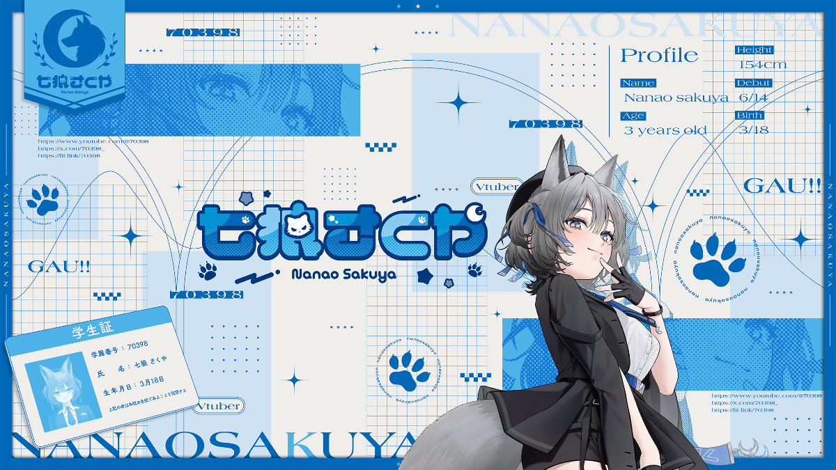 ↳ 名前 : 七狼さくや(Nanao Sakuya)↳ 誕生日 : 3/18↳ 年齢 : 狼年齢 3歳(人間だと大人)↳ 身長 : 154cm(耳は入れない)↳ ファンネーム : 群れ↳ ファンマーク : 🐺💙↳ 特技 : 人前で喋る、社畜、コスプレ関連全般、早口、噛まないスパチャ読み、他人の運気を上げる↳ 好きなもの : スニーカー、グミ、ガチャガチャ、神社、防災、ジム、犬、和菓子、水、甘いお酒、青系色↳ 苦手なもの : ホラー、ゲーム、香草類、道を覚える、ブラックコーヒー、ヒールがある靴、甘くないお酒、友達を遊びに誘う、ジャンプ↳ ママ : となみ涼 さま↳ パパ : 冬乃グミ さま