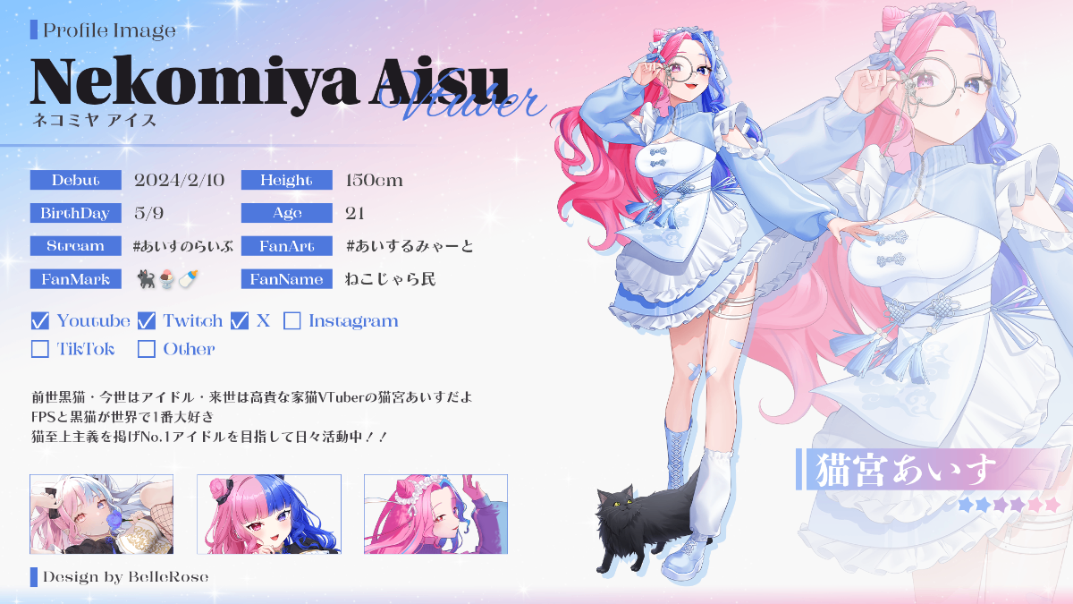 推しに憧れてアイドル目指してる女の子 🍨猫宮あいすだよ🐈⬛前世は実は猫だったかもしれないって言われるくらいの人間なんだ💭いつか大きな舞台でライブするのが夢✨一緒に素敵な思い出いっぱい作ろうね📷💭💓猫とは別に実はばぶちゃん🍼って言われることも多いポンコツなのに顔に似合わず超毒舌な一面も……?そんな猫宮を好きになってくれると嬉しいな?♡依頼について
