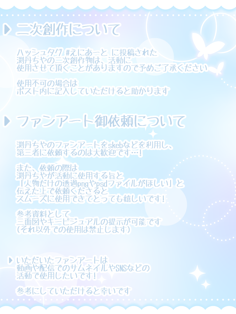 - ✦ 配信について・他の方の配信で私の名前を出すのは×です(私の配信でも他の方の名前を出さないでほしいです)・話題に関係のないコメント、雰囲気を壊すようなコメント、自分語り、皆が嫌な気持ちになるコメントは×・「落ちるね」「離席します」などのコメントは寂しくなるので控えてほしいです…退室コメントではなく戻ってきた時に「ただいまー!」と言ってもらえたら嬉しいです・悪口や荒らしなどは無視するか見えないようにブロックするなど各自で対応してほしいですあまりにひどいものは渕丹が対応しますがコメント数が増えると配信のインプレッションが上がって嬉しいので基本的に誹謗中傷も数字稼ぎにしか見えてません₍ᐢ. ̫.ᐢ₎ご安心ください✦ 配信や動画の切り抜きについて・配信の切り抜きは引用元アーカイブのURLと、切り抜き用タグ #みにちゃちゃるうむ の記載がある場合のみSNSなどへ投稿OKです・無編集に近い転載は基本的に×です✦ 歌枠について・下手の横好きですこう歌うといいよ!と言われても対応できかねます₍ᐢ. ̫.ᐢ₎むしします・基本的にリクエスト大歓迎です本ページ上記リンクにあるソングリストの中から選んでください・気が向いた時でいいので「8888」や「 💎 💤 ❄ 」などのコメントやFM字幕で盛り上げてくれたらとってもとっても嬉しいです⸝⸝ᐢ. ̫.ᐢ⸝⸝・ED曲の4択クイズは①100万 ②5000万 ③1億 ④10億 です✦ ゲームについて・基本的に楽しくやりたいエンジョイ勢ですまた、ゲーム下手なので画面酔いにはご注意ください・指示厨はむしします麻雀で「自分ならこう選択するかな~」などの発言は大歓迎です(՞ . ̫ .՞)・ネタバレ禁止です皆が楽しめるようにご協力お願いします以上が守れない、改善の余地が無いと判断した場合、ブロックの対象となります。ご了承ください