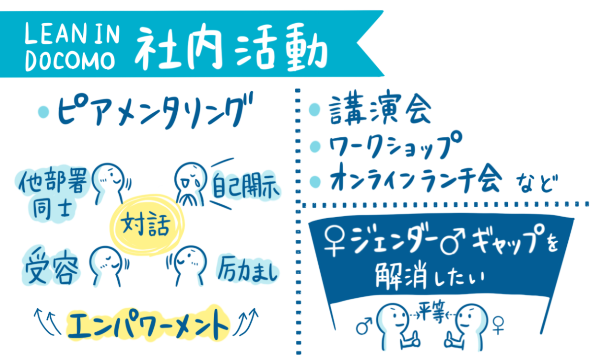 - 【LEAN IN DOCOMO】は、ドコモ女性社員のエンパワーメントサークルとして2018年に発足しました。NTTドコモ人事部の職場公認サークルであり、日本で初めてのLean Inの企業内サークルでもあります。LEAN IN DOCOMOのミッションは、「ドコモグループの女性が、自信・勇気・志をもって一歩踏み出すきっかけをつくる」こと。部署の枠を超えて全国の仲間と対話を通して相互に支え合う【ピアメンタリング】や、オンラインランチ交流会・社内外から講師を招いての講演会・ワークショップなども開催しています。---------------------------------------------------------これらの活動の根底には「ジェンダーギャップを解消したい」という想いがあります。女性のエンパワーメント活動は、男性・女性どちらか一方を優位にするものではなく、「ジェンダーギャップ=性による"差"」をなくすための活動でもあります。キャリアの壁に直面しやすい女性を中心に活動してはいますが、Lean InおよびLEAN IN DOCOMOには男性も携わっており、講演会やワークショップなどにはこれまでに多くの男性が参画しています。---------------------------------------------------------ダイバーシティ=多様性が問われる現代社会の中で、誰もが性別に関係なく、その人らしく輝けるように。男性も女性もともに対等で平等でいられるように―――LEAN IN DOCOMOは女性のエンパワーメントサークルとしてはじまりましたが、目指すところは男女相互のエンパワーメントです。その未来を実現するための一歩として、女性が励まし合える活動や環境づくりをはじめ、男女が共に課題を解決し合える社会を目指し、さまざまな取り組みを行っています。