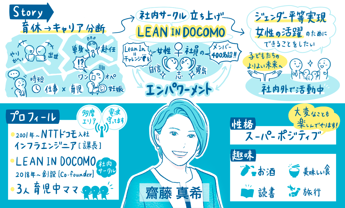 ---------------------------------------------------------こんにちは、齋藤真希です。私は現在、NTTドコモでインフラエンジニアとして働きながら、三人の子どもを育てています。数年前、私は第一子の出産・育児を機に、女性ならではの「キャリア分断」を経験しました。その悩んだ経験を糧に2018年、ドコモグループ公認の女性社員サークル【LEAN IN DOCOMO】を設立。「ドコモグループの女性が、自信・勇気・志をもって一歩踏み出すきっかけをつくる」をミッションに、400名を超える仲間とともにお互いをエンパワーメントし合っています。さらに社内外の枠を超え、ジェンダー平等・DE&I(ダイバーシティ・エクイティ&インクルージョン)の実現に向けてさまざまな活動をしています。LEAN IN DOCOMOの活動、私や仲間たちの想いについて、少しでも興味を持っていただけたら嬉しいです。