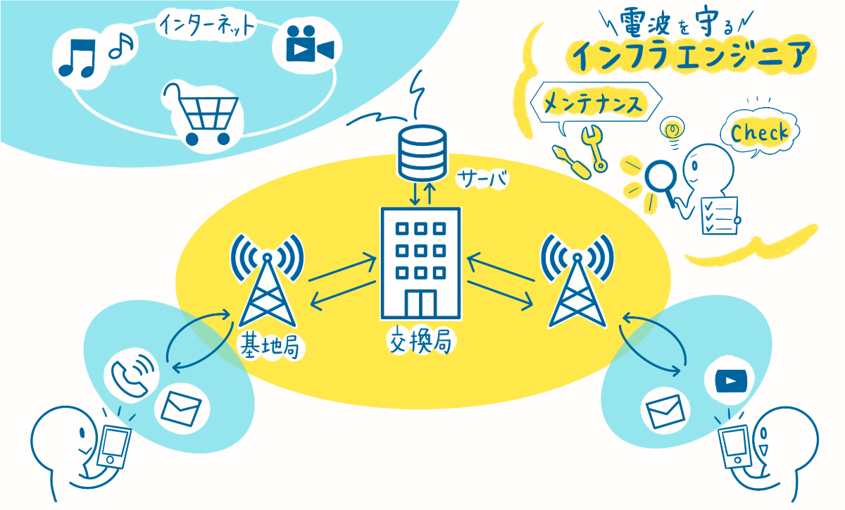 ---------------------------------------------------------インフラエンジニアは、さまざまなシステムの基盤となるITインフラの設計・構築・運用・管理などを担う存在です。そして、ドコモのインフラエンジニアは簡単に言うと「ドコモの電波を守る人」 ドコモの通信エリアを構築し、交換機やサーバを置いてネットワークを整え、基地局のアンテナのメンテナンスや修理を行っています。多くの人の生活の基盤にある「通信」が安全に快適に行えるよう、見えないところで点検や整備を行い、お客様の暮らしを支えています。