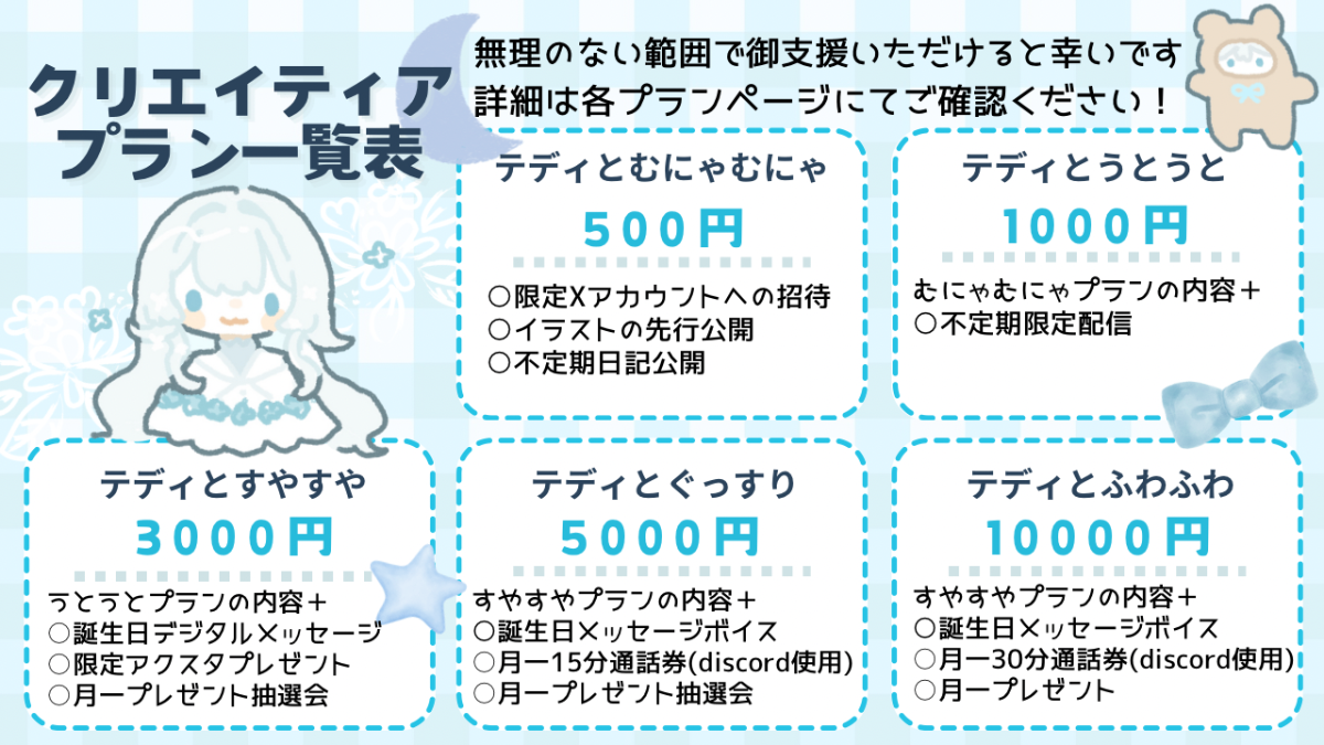 *配信やネット上のルール及びマナーを守り、節度をもって楽しんでください•基本的にDMにはお返事できませんので、何かあればリプライをお願いします。※禁止行為をされた方は、警告した上で改善が見られない場合ブロックさせていただきます。*ファンアート大歓迎です•FAタグにて投稿いただいた作品は、縫白テディがサムネイルやツイート等の活動において取り上げたり使用することがございます。※使用不可の場合は記載していただくか、タグなしでの投稿をお願いします。︎•絵師様へのskebや依頼等も大歓迎です!※ご依頼の際は、①縫白テディの活動において使用する可能性がある旨、また②背景とは別に人物だけの透過PNGも納品いただきたい旨の2点を伝えてご依頼いただけると大変助かります。(ご依頼いただいたものはご依頼者様に限り製作者様の規約内でご利用ください。)•縫白テディの素材を使用しての活動(商用利用・反社会的・差別・宗教・政治的内容を含むもの・第三者の権利を侵害する等)はしないでください。⚠️配信のルール