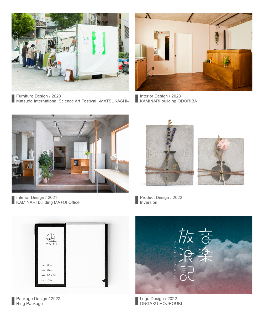 MA+OI代表クリエイターズアソシエーション MA+OI HUB運営KAMINARI オドリバ 企画運営都立工芸高校 インテリア科卒業桑沢デザイン研究所 スペースデザイン専攻卒業1998年東京生まれ。2020年に桑沢デザイン研究所スペースデザイン専攻を卒業後、『空間と時間のデザイナー』として、空間デザインやイベントの企画運営を行う。2020年、ファッションブランドBergere et Paysansと共にMA+OI Designとして活動を開始。20代の多様なジャンルのデザイナー、アーティストが集うクリエイターズコミュニティFuelwaを設立。2021年6月には、浅草のシェアアトリエ/カフェバーが一体となったビル『KAMINARI』の一室をリノベーションし、MA+OI ASAKUSA OFFICEが完成。2022年から、KAMINARI全体を利用した年に一度のマーケットイベント「TIME+FES」を主催。毎月開催のDJイベント「お洒落ロック」をKAMINARI 1Fほしや、3F 岸野雄一と三者共同で主催開始。2023年6月には、KAMINARIの2階、入居者共用部を、様々なクリエイターやアーティストが使用できるイベントスペース「オドリバ」として改装し、活動と交流の場をつくることを目的とした「KAMINARI UPDATE PROJECT」を企画。入居者に呼びかけ、企画のディレクションを行いクラウドファンディングを実施。
