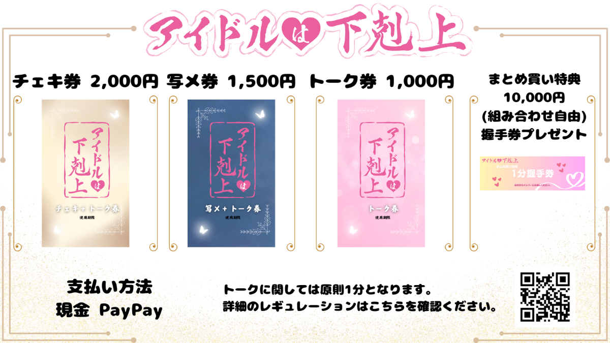 ①チェキ券(1枚2,000円)写メ券(1,500円)トーク券(1,000円)をご購入