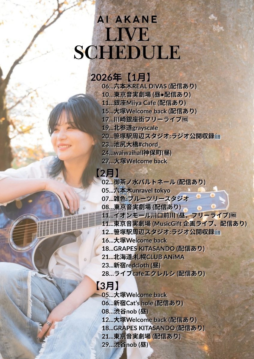夢を諦めきれず、2021年〜シンガーソングライターとしてライブハウスや配信でのLIVE活動を開始。現在は東京・神奈川を中心に活動中。人の感情や心情に寄り添い受け止めるように言葉を紡ぐ。2022年〜ギターを始めたことを機に作曲にも精力的に取り組み、ジャンルに囚われることなく不思議と耳に残る歌声で歌い上げる。A.entertainment (アドットエンターテイメント)所属9月5日生まれ・O型・大分県出身。【全17曲 リリース】◾️2021年9月 1st Single「想い・アカネイロ」◾️2022年6月 2nd Single「Be free!」◾️2022年11月 1st Album「Story」◾️2024年4月 3rd Single「愛の色」(Digital Release)◾️2024年12月 4th Single「喜劇は廻り続けている」(Digital Release)◾️2025年3月 5th Single「輝く星」(Digital Release)全国CDショップ、茜音愛official ECサイトで販売中【タイアップ】テレビ朝日系列「アカネイロ」「Be free!」千葉テレビ放送「My way」お問い合わせはこちらから