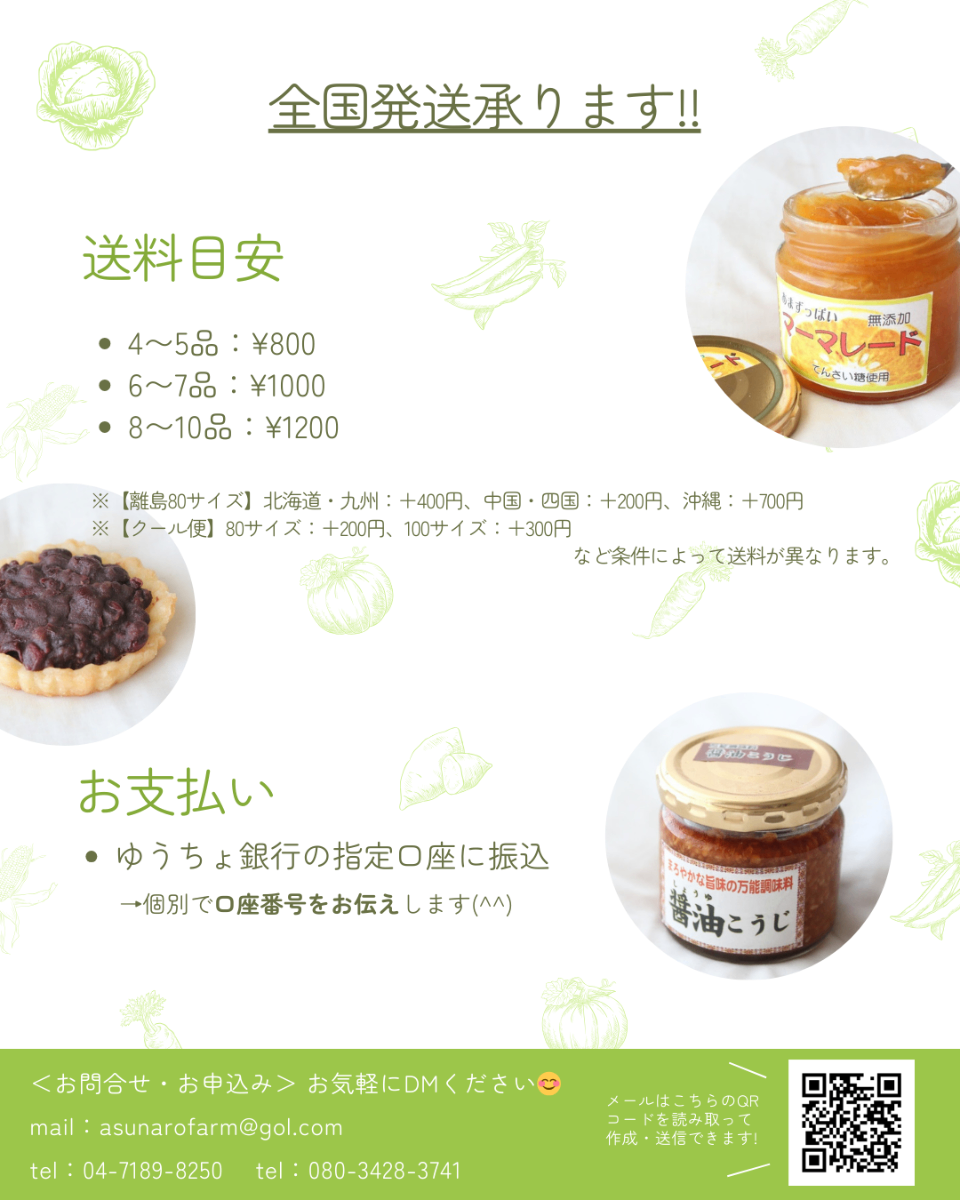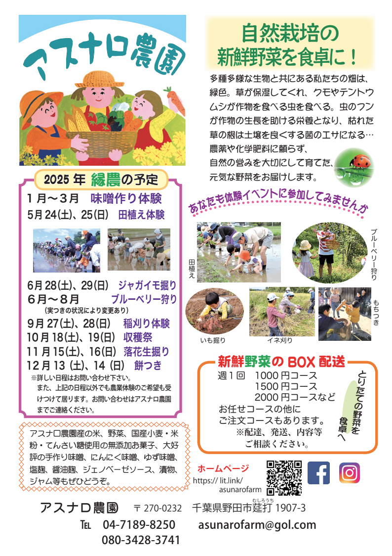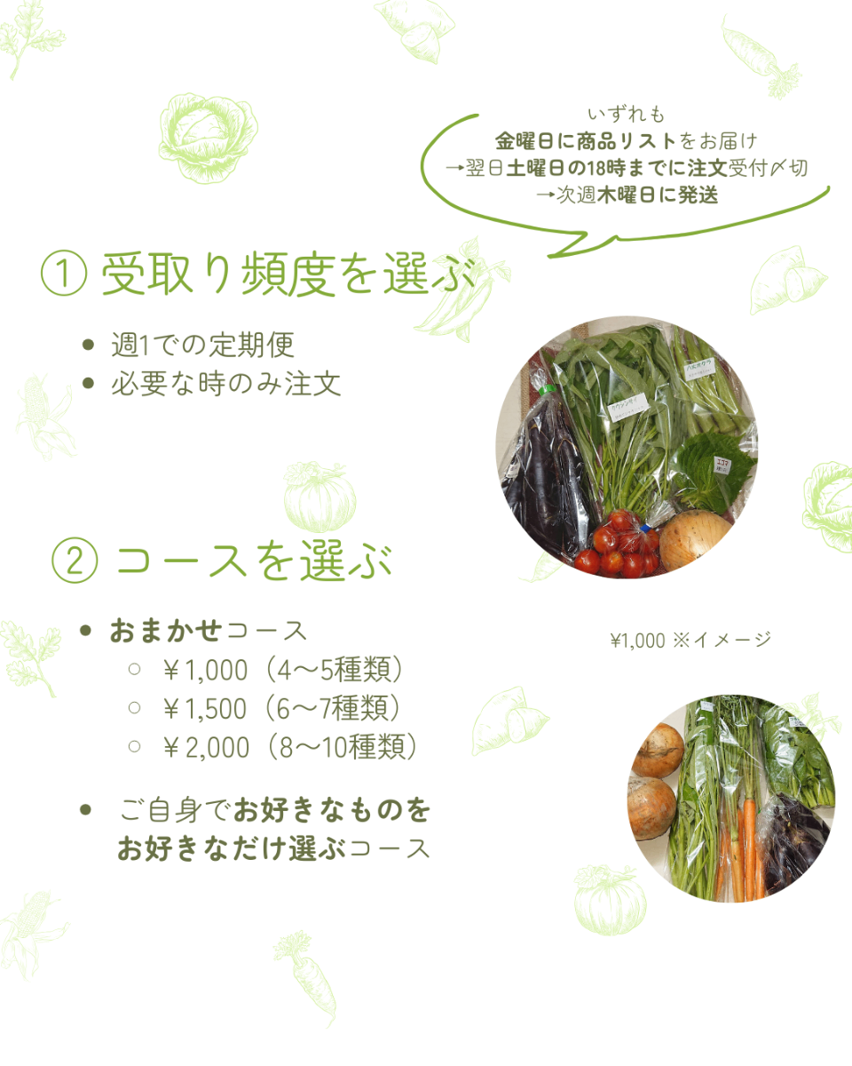 【春】たけのこ、ミニトマト、絹さや、スナップえんどう、ツタンカーメン、小松菜、ほうれん草、ニンジン、葉つきニンジン、春菊、のらぼう菜、ナバナ、ジャガイモ、タマネギ、レタス、ケール etc【夏】ミニトマト、ズッキーニ、きゅうり、とうもろこし、枝豆、まくわ瓜、ナス、カボチャ、シャドークイン、ピーマン、甘唐辛子、オクラ、モロヘイヤ、空心菜、アップルミント、バジル etc【秋】さつまいも各種、小松菜、里芋、水菜、春菊、ズッキーニ、落花生、大根、紅くるり、紅心大根、カブ、ネギ、タアサイ、チヂミナ、ラディッシュ、フレンチブレックファスト、 etc【冬】ネギ、大根、かぶ、聖護院大根、聖護院カブ、小松菜、ほうれん草、白菜、キャベツ、ブロッコリー、レタス、ミックスサラダ、ラディッシュ、ケール、あずき etc無添加お菓子や調味料等も!