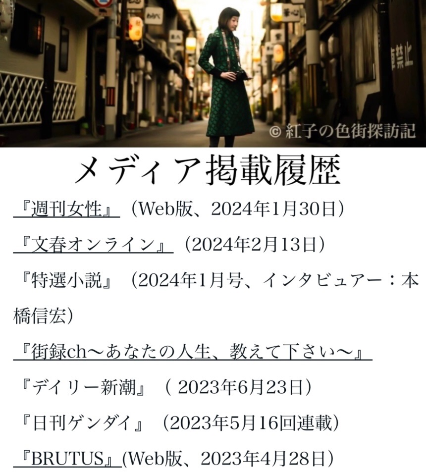 10 代で風俗嬢となり関東各地の風俗街を 13 年以上転々とする。32歳で吉原を引退後はシングルマザーとなり、子育てとパート仕事の日々。 2021年48歳からカメラを始め、風俗街、赤線、遊廓跡地などを訪れ、日本各地に残る色街の風景を記録している。 2023年12月写真集「紅子の色街探訪記」出版