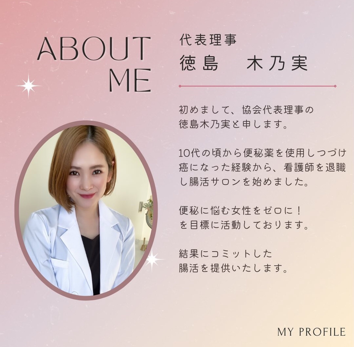 看護師資格取得・手に職をつけて、自立する為に看護師資格を取得美容部員・美容やメイクに興味を持ち、美容部員を始める看護師(15年)・もう一度看護師として働きたいと考え、医療現場へ戻る腸活サロン・25年間便秘を放置し、癌になったことから腸活を始める・ 便秘に悩む女性をゼロにするため、腸活サロンを始めた