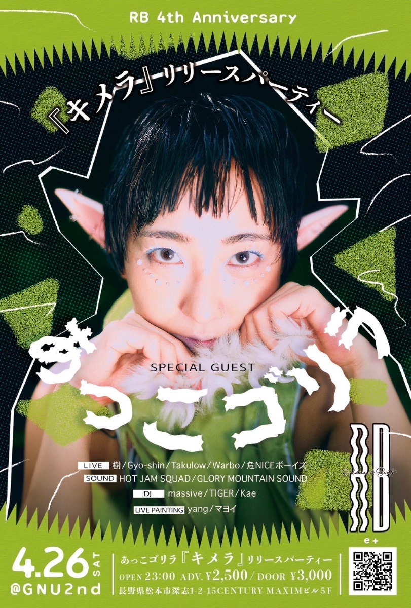 RB -Riddim & Beats- Vol.25〜あっこゴリラ『キメラ』リリースパーティー〜2025.04.26.SAT at.GNU2ndAdv ¥2,500/Door ¥3,000OPEN 23:00 -🎫https://eplus.jp/sf/detail/4292370001-P0030001SPECIAL GUEST- あっこゴリラ-LIVE-樹 Gyo-shin Takulow Warbo 危NICEボーイズ -SOUND- HOT JAM SQUAD GLORY MOUNTAIN SOUND-DJ-massive TIGER Kae -LIVE PAINTING- yang マヨイ23:00 massive23:40 TIGER24:20 樹24:35 Gyo-shin24:50 Takulow01:05 Warbo01:20 危NICEボーイズ01:35 あっこゴリラ -SPECIAL GUEST- 02:05 Kae02:45 HOT JAM SQUAD03:30 B2B