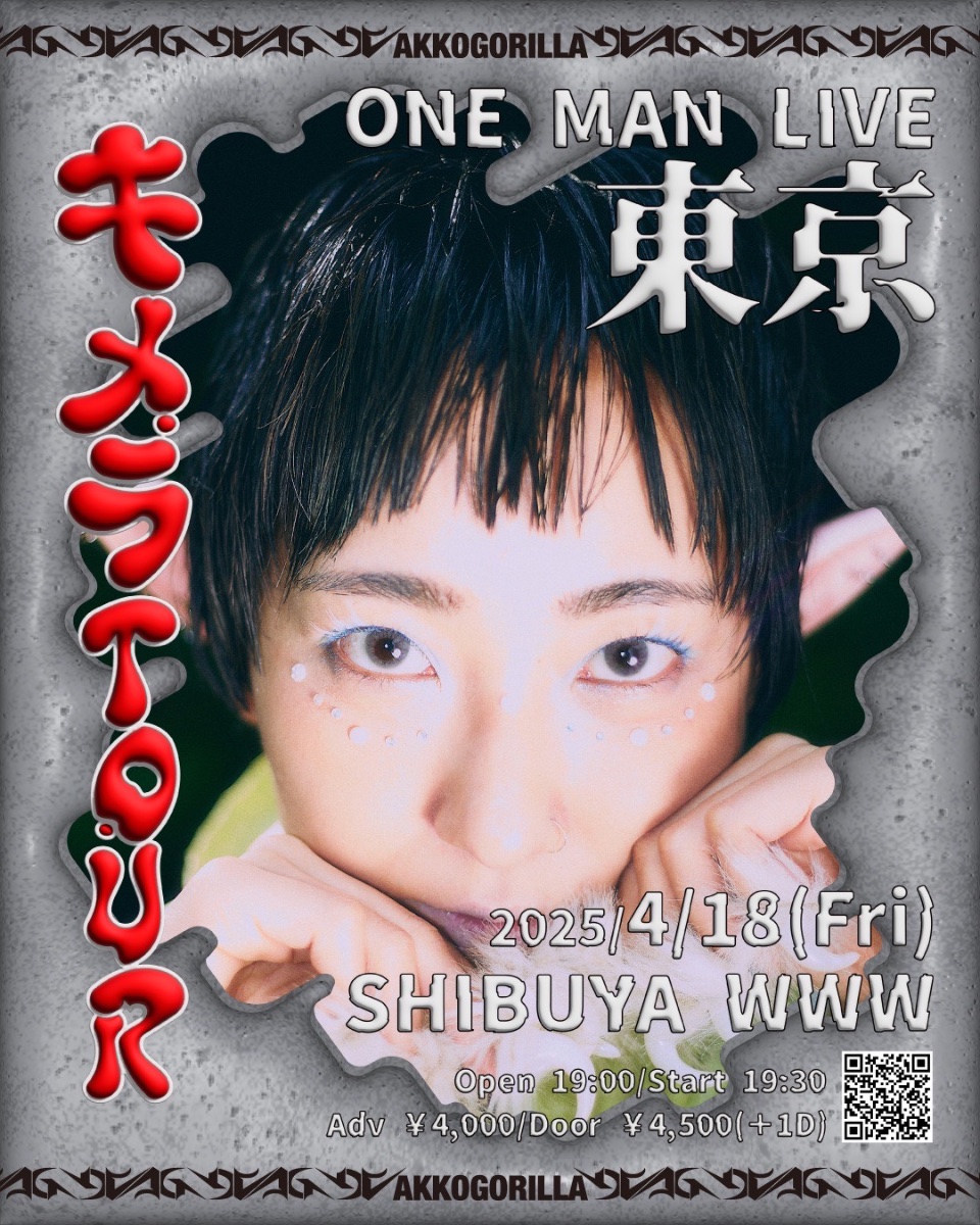 あっこゴリラキメラTOUR〜だから祭をするホモサピエンス〜2025/4/18(Fri)SHIBUYA WWWopen 19:00/start 19:30adv ¥4000/door ¥4500 +1D※整理番号付き🔺ACTあっこゴリラ(ワンマンライブ)BAND SETand more🎫受付URLぴあ:https://w.pia.jp/t/akkogorilla/ローチケ:https://l-tike.com/akkogorilla/ イープラス:https://eplus.jp/akkogorilla/お問い合わせ:SOGO TOKYO03-3405-9999(月〜土 12:00〜13:00/16:00〜19:00※日曜・祝日 を除く)http://www.sogotokyo.com/