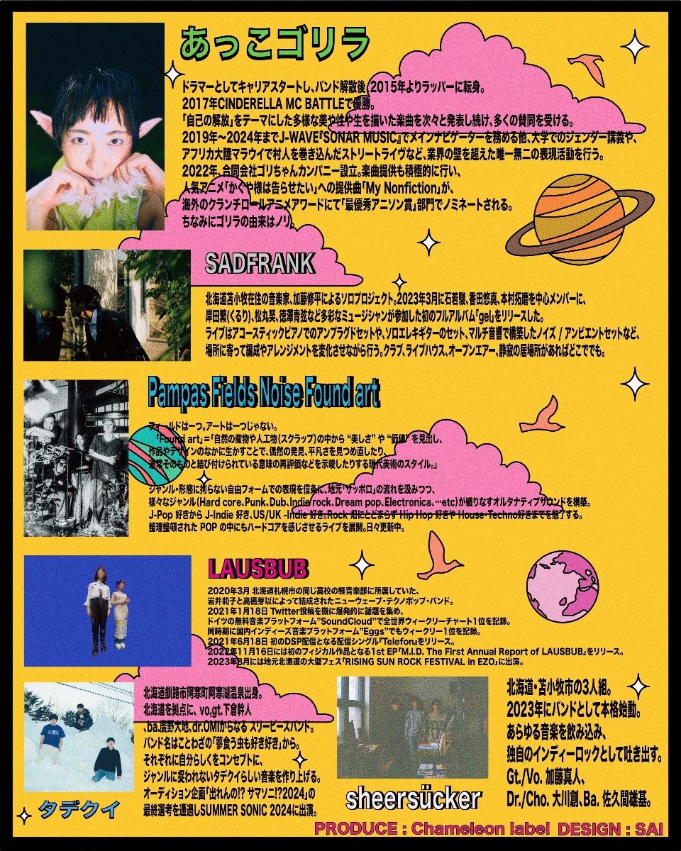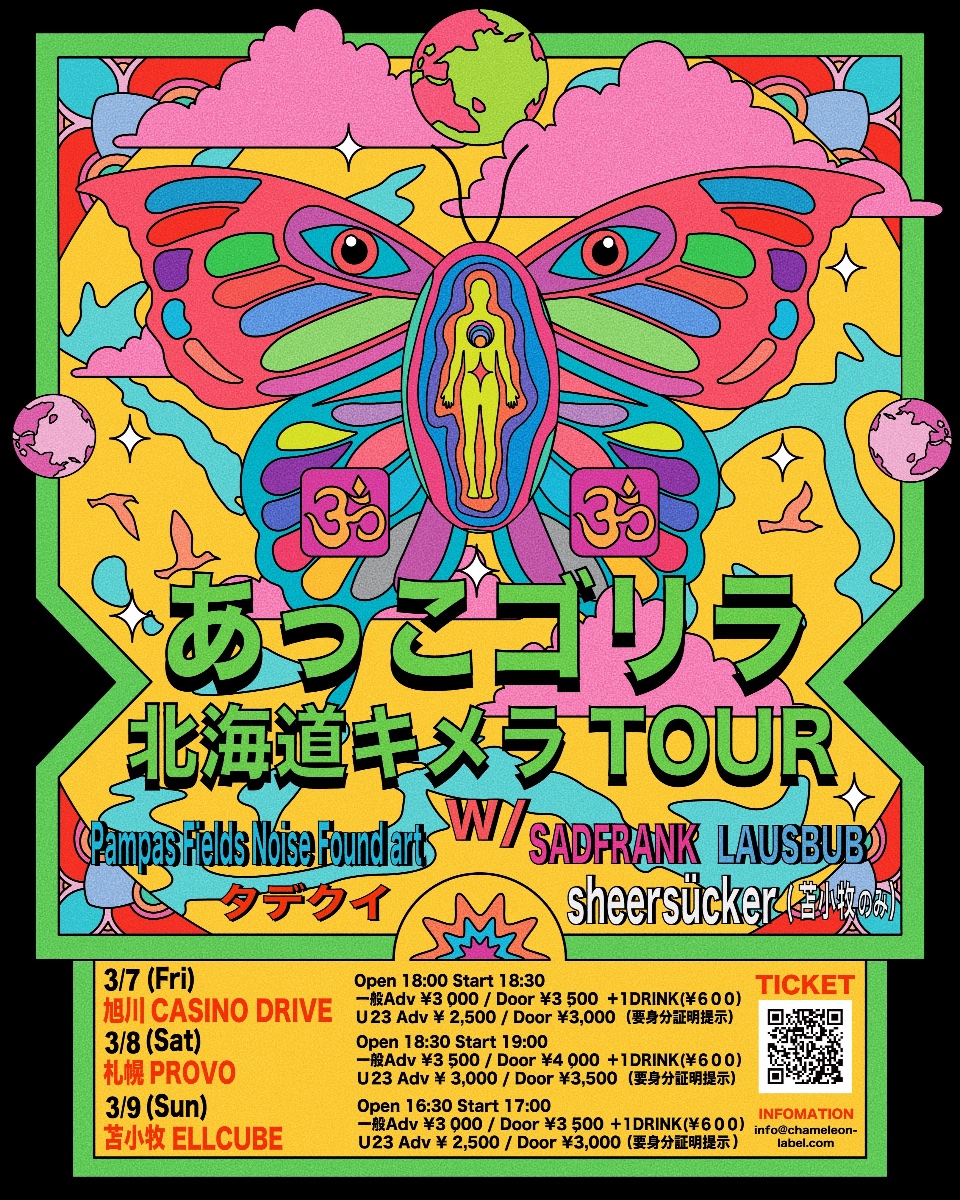 「あっこゴリラ 北海道キメラTOUR」出演あっこゴリラSADFRANKLAUSBUBPampas Field Noise Found ArtタデクイSheersücker(苫小牧のみ)▶︎2025年3月7日(金)旭川カジノドライブOpen 18:00 Start 18:30一般Adv ¥3,000 / Door ¥3,500Under23 Adv ¥ 2,500 / Door ¥3,000 (要身分証明提示)1ドリンク¥600別途▶︎2025年3月8日(土)札幌PROVOOpen 18:30 Start 19:00一般Adv ¥3,500 / Door ¥4,000Under23 Adv ¥ 3,000 / Door ¥3,500 (要身分証明提示)1ドリンク¥600別途▶︎2025年 3月9日(日)苫小牧ELLCUBEOpen 16:30 Start 17:00一般Adv ¥3,000 / Door ¥3,500Under23 Adv ¥ 2,500 / Door ¥3,000 (要身分証明提示)1ドリンク¥600別途🎫https://t.livepocket.jp/t/m4puzINFORMATION Chameleon Labelinfo@chameleon-label.com