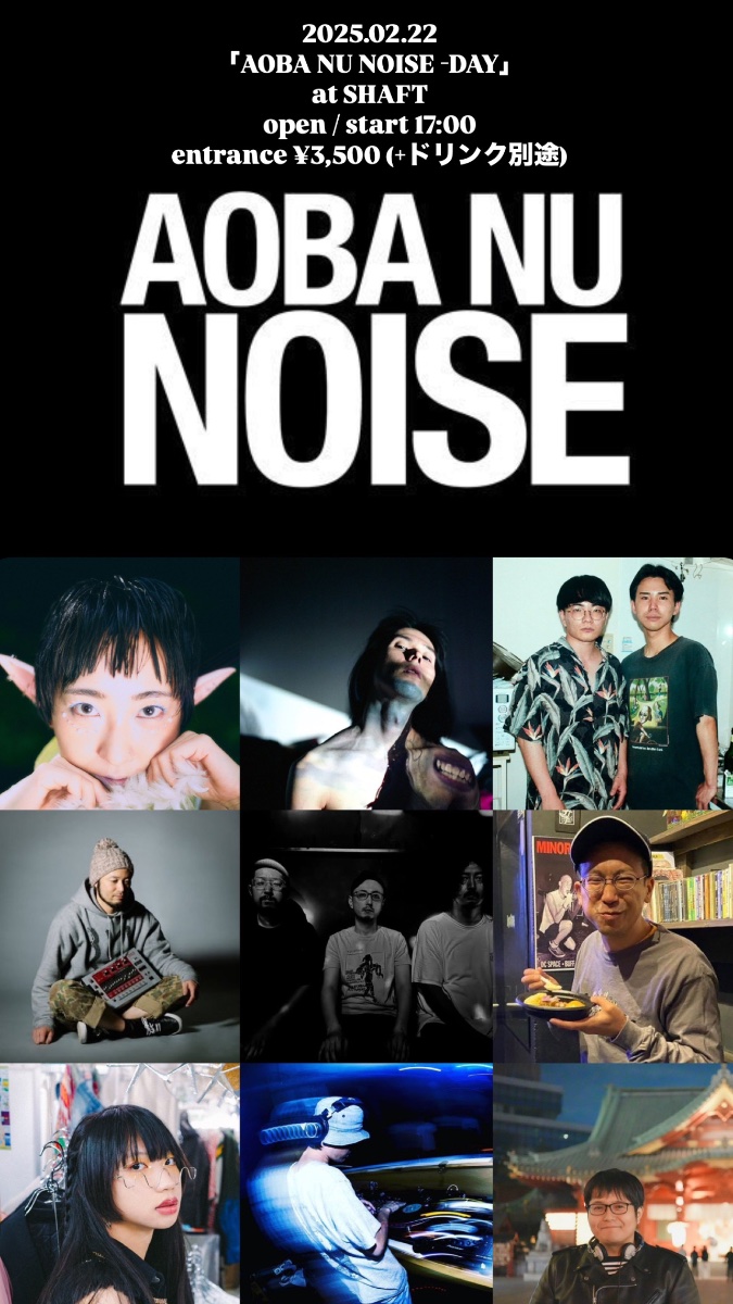 2025/2/22(Sat)at SHAFT「AOBA NU NOISE -DAY」open / start 17:00entrance ¥3,500 (+ドリンク別途)※当日券のみですLIVEあっこゴリラPICNIC YOU SENDIll Japonia(aka Taigen Kawabe from Bo Ningen)Waikiki ChampionsDJ heykazmaEVOLCASINSHINYATAKATORI(RAF-REC)