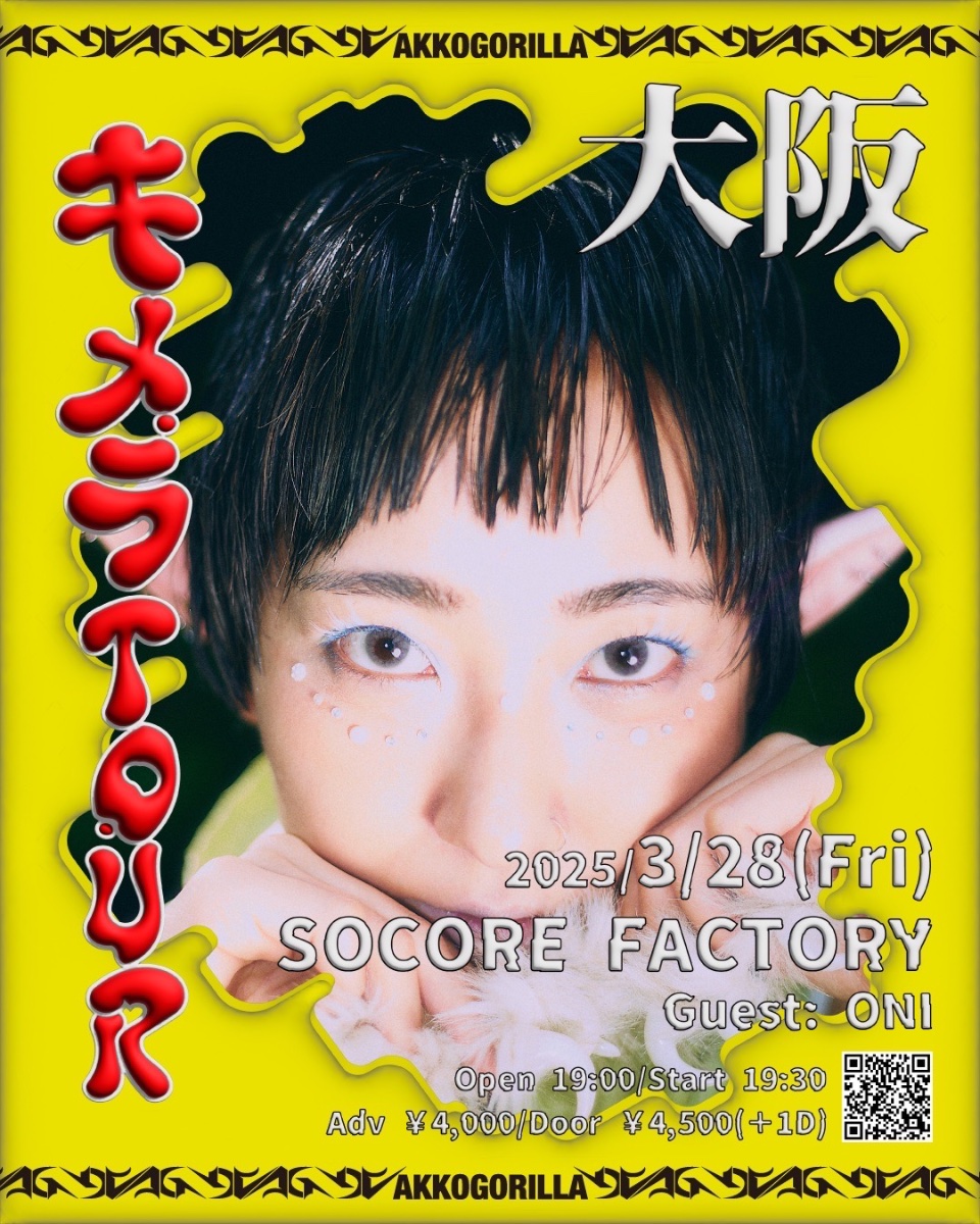 あっこゴリラキメラTOUR〜だから祭をするホモサピエンス〜2025/3/28(Fri)SOCORE FACTORYopen 19:00/start 19:30adv ¥4000/door ¥4500 (+D)🔺ACTあっこゴリラguest:ONI🎫https://socorefactory.com/schedule/2025/03/28/あっこゴリラ-キメラtour/
