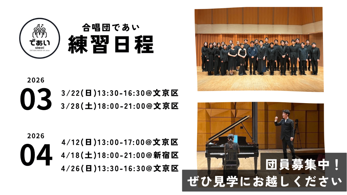2022年の1月に発足した混声合唱団です。 様々な楽曲との「であい」を楽しんで活動中。 平均年齢は20代!土日に文京区を中心に活動しています。