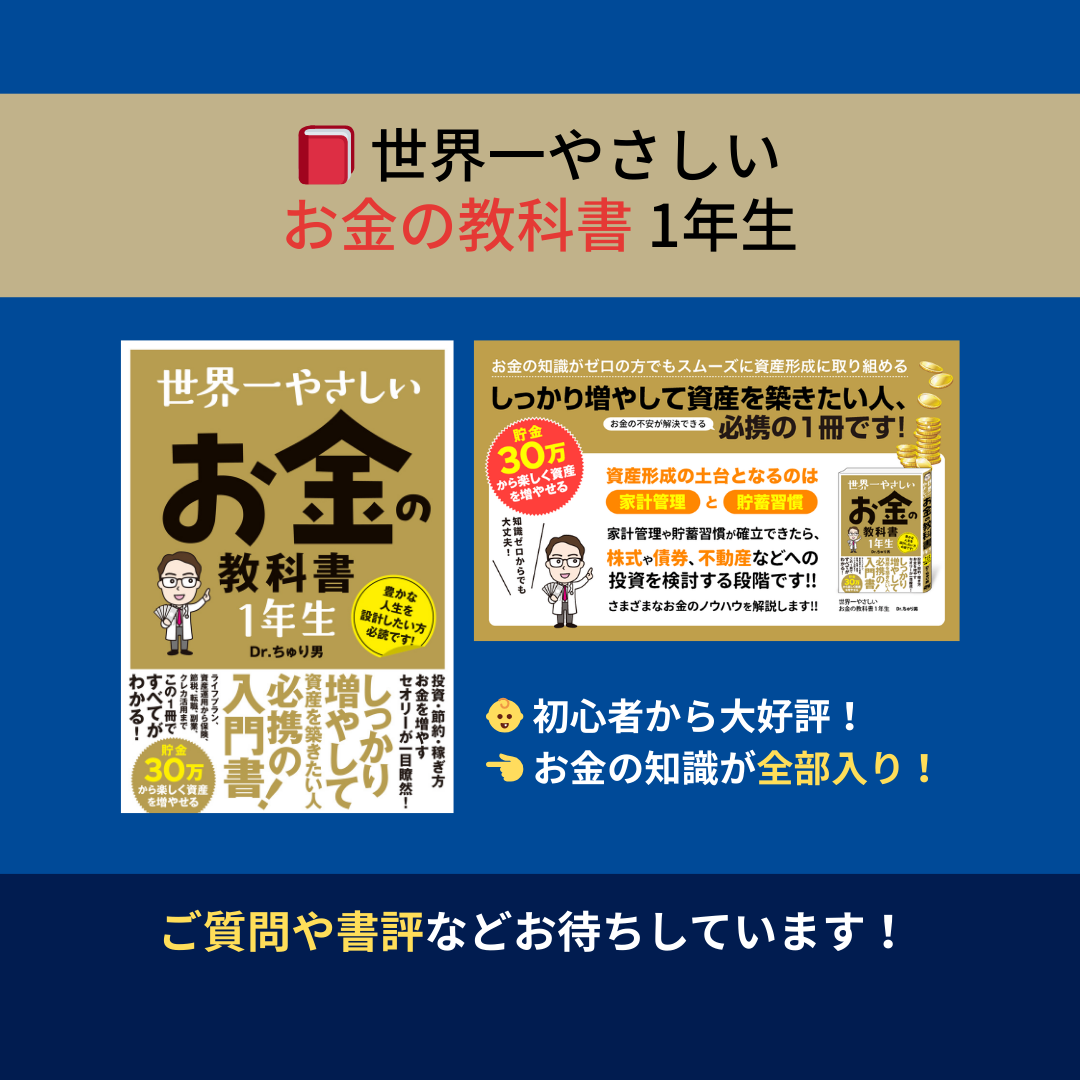 医師×投資ブロガー。 累計2,900万PVのブログ「Dr.ちゅり男のインデックス投資」運営。 著書: 📘『世界一やさしいお金の教科書 1年生』 📘『世界一やさしい投資信託・ETFの教科書 1年生』 📺 YouTubeでは「新NISAや最新の投資戦略」を60秒でわかりやすく解説中! 👇 ブログ・SNS・書籍はこちらからご覧ください。