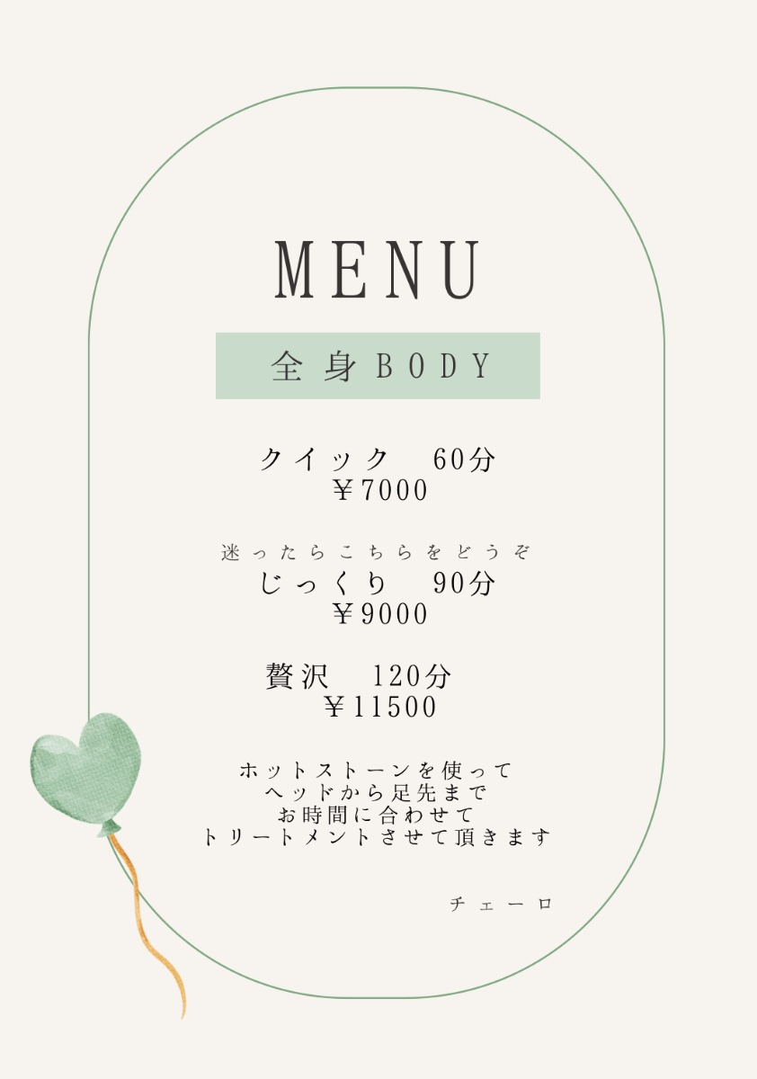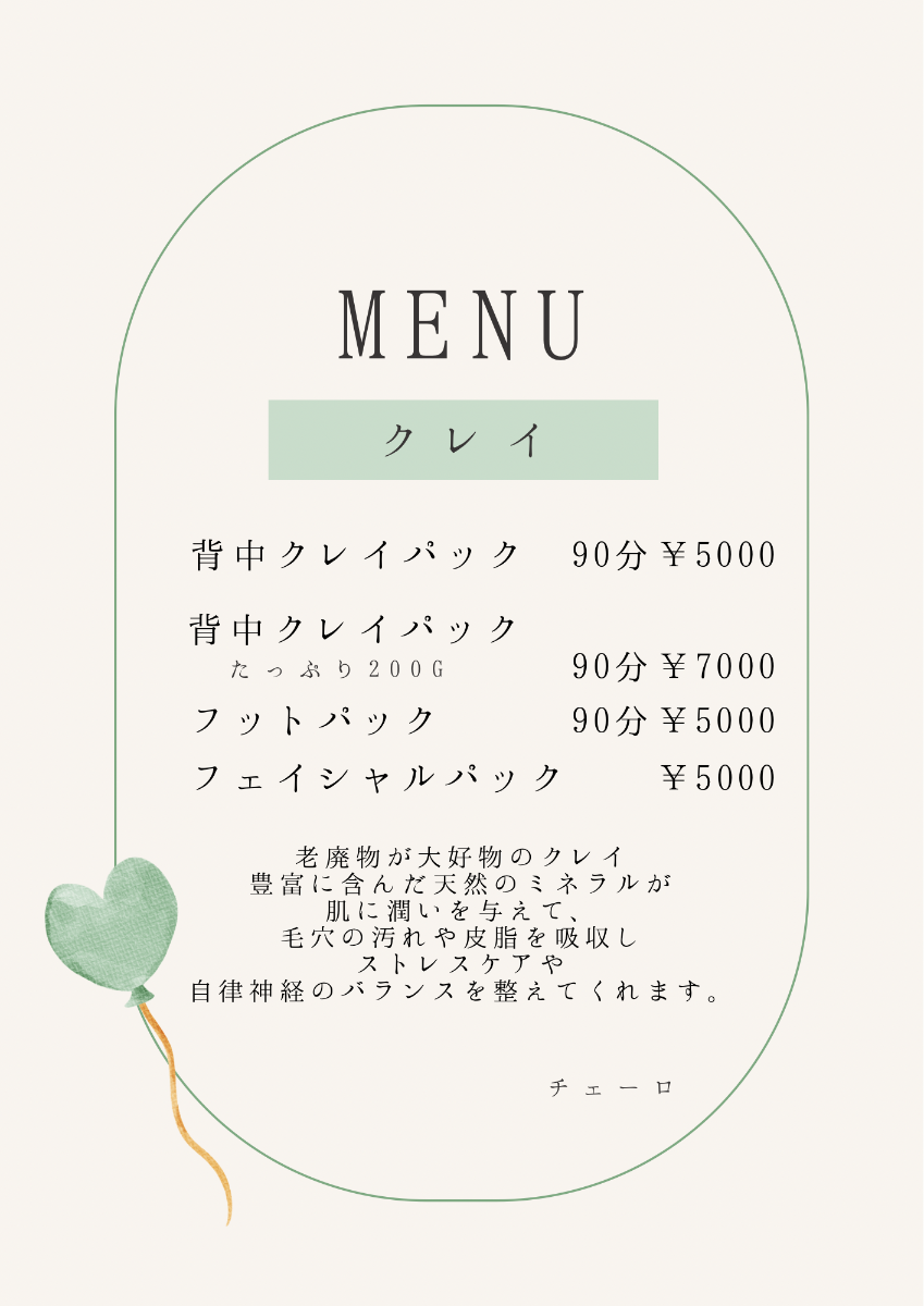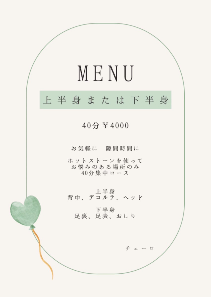 はじめまして。オーナーのじゅりと申します。 宮崎に来て15年 2022年、大好きなトリートメントが出来る サロンをオープンする事が出来ました。 初めて生理を迎えた時から 痛みやPMS ダイエットや 妊娠や産後の身体 更年期とその後も‥ 私達の心と身体と女性ホルモンはいつも関わっています。 身体の不調のサインには 病気が隠れている事があります。 病院の先生やお薬に頼る事はとっても大切です。 それでもなんとなく続いている不調 いつもの事だから‥ 更年期だから‥と 当たり前の様に過ごしていませんか? まずは自分の心と身体と向き合う時間から はじめてみませんか? クレイとストーンとアロマで 深部まで温め、ゆるめていきます 癒しの時間と共に巡る身体に🌿