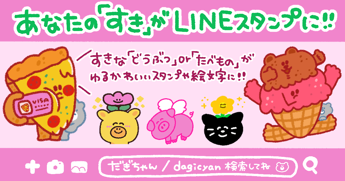 好きな "どうぶつ" or "たべもの" をリクエスト♪ だぎちゃんがゆるかわキャラにして LINEスタンプまたは絵文字としてリリースします!