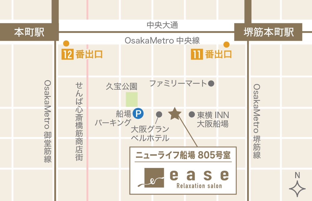 【本町駅】より徒歩でお越しの場合12番出口を出て、右方面に進みます。2つ目の曲り角を右折し直進します。左側に立体駐車場が見えるのでその十字路を左折し直進します。「大阪グランベルホテル」を過ぎて少し進むと、右側に見える建物「ニューライフ船場」の805号室が当サロンでございます。▪️Osaka Metro長堀鶴見緑地線【心斎橋駅】より徒歩でお越しの場合クリスタ長堀にある北8出口のエスカレーターを上り、すぐに左折をして心斎橋筋商店街を暫く直進します。6つ目の曲がり角(右側に「シモジマ」が見えるのでその過ぎた角)を右折し直進します。右側に見えてくる「大阪グランベルホテル」を過ぎて少し進むと、右側に見える建物「ニューライフ船場」の805号室が当サロンでございます。