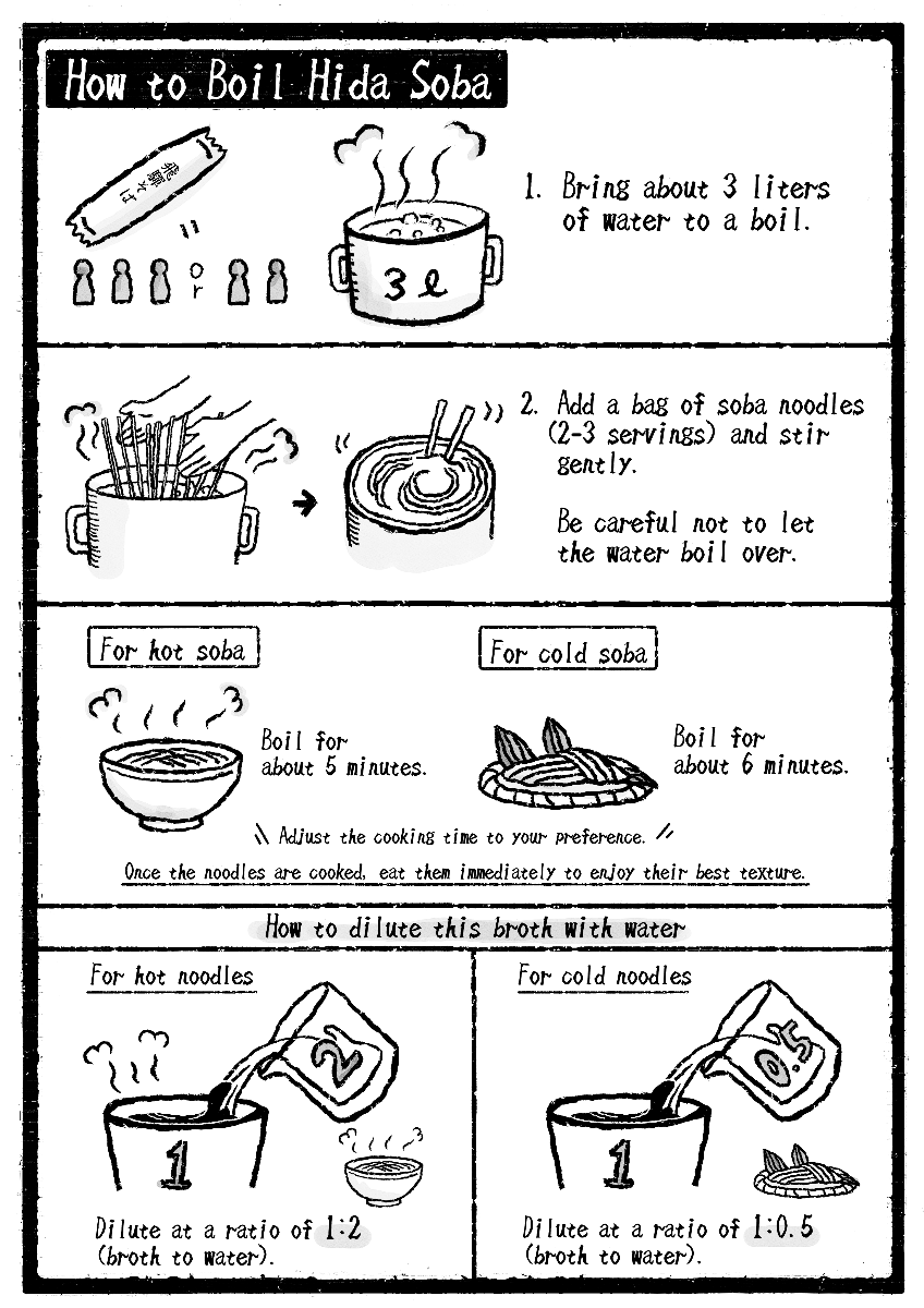 - We carefully choose only the finest ingredients from buckwheat to wild vegetables and soup stock. It takes a long time to produce tasty soba soup with our secret recipe, and it's a delicacy that will never disappoint. Hida is a very ideal environment for soba making, and we are proud of offering the local soba cuisines and every seasonal dish with utmost care.