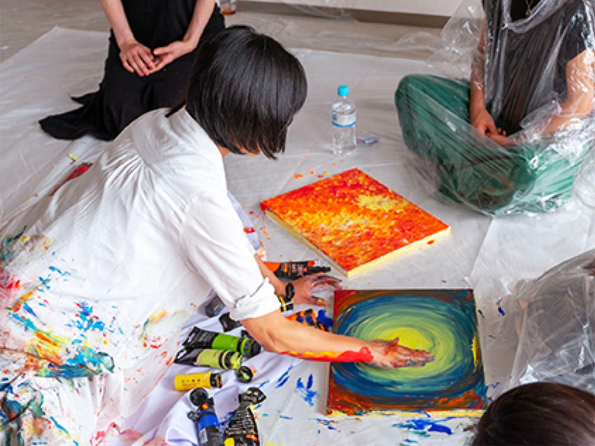 でも、自分自身の日常の呼吸、目の前の景色、耳に届く音、肌をなでる風、そして心に湧き上がる感情――それらすべてをアートの素材と捉え、瞬間の心を色に変えて重ねていく。そんな時間も大切にしたい。今という一瞬に心を向ける生き方そのものの実践、提案でもあります。