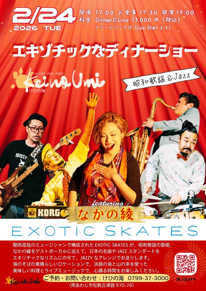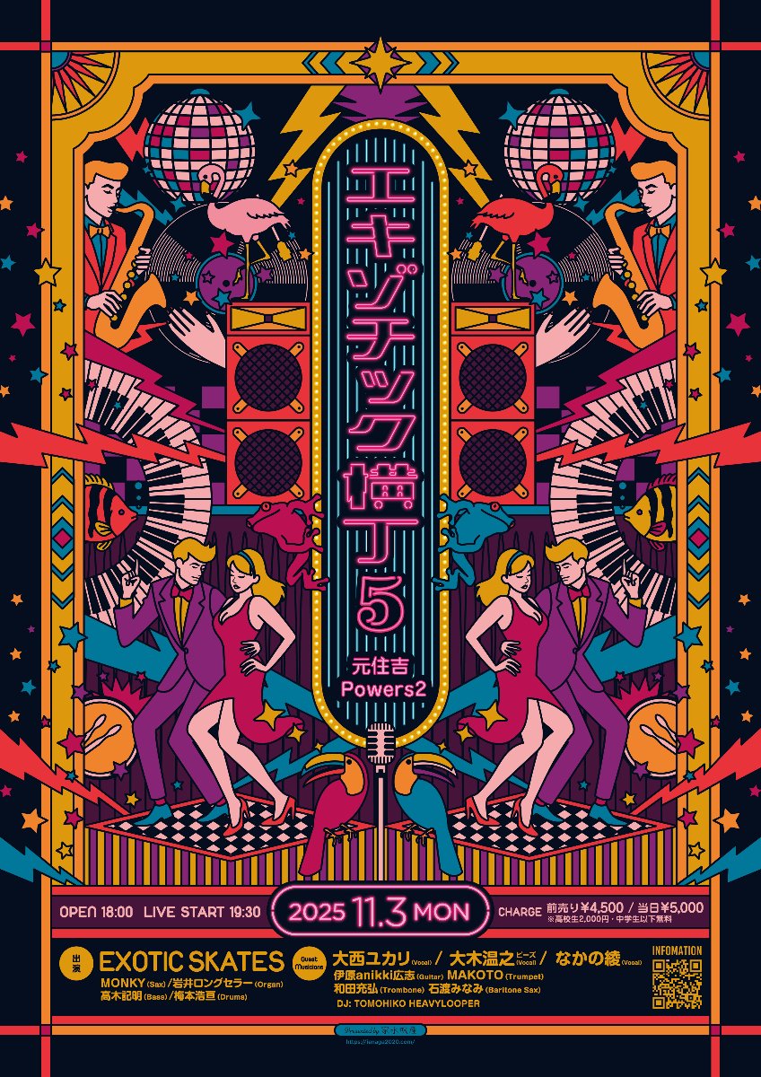 ■ EXOTIC SKATES 2022年結成。元Black Bottom Brass Bandのサックス奏者MONKYをフロントに、関西バンドシーンで大活躍のオルガン奏者 岩井ロングセラー、ドラムに梅本浩亘、ベースに高木記明という強力なリズムセクションを擁する。 ジャズとスカ・レゲエがファンキーに融合したエキゾチック・ファンクバンド。 Formed in 2022. Fronted by former Black Bottom Brass Band saxophonist MONKY, the band features a strong rhythm section: organist Iwai Longseller, who is very active in the Kansai band scene, Hiromoto Umemoto on drums, and Noriaki Takagi on bass. Exotic funk band with a funky fusion of jazz, ska and reggae.