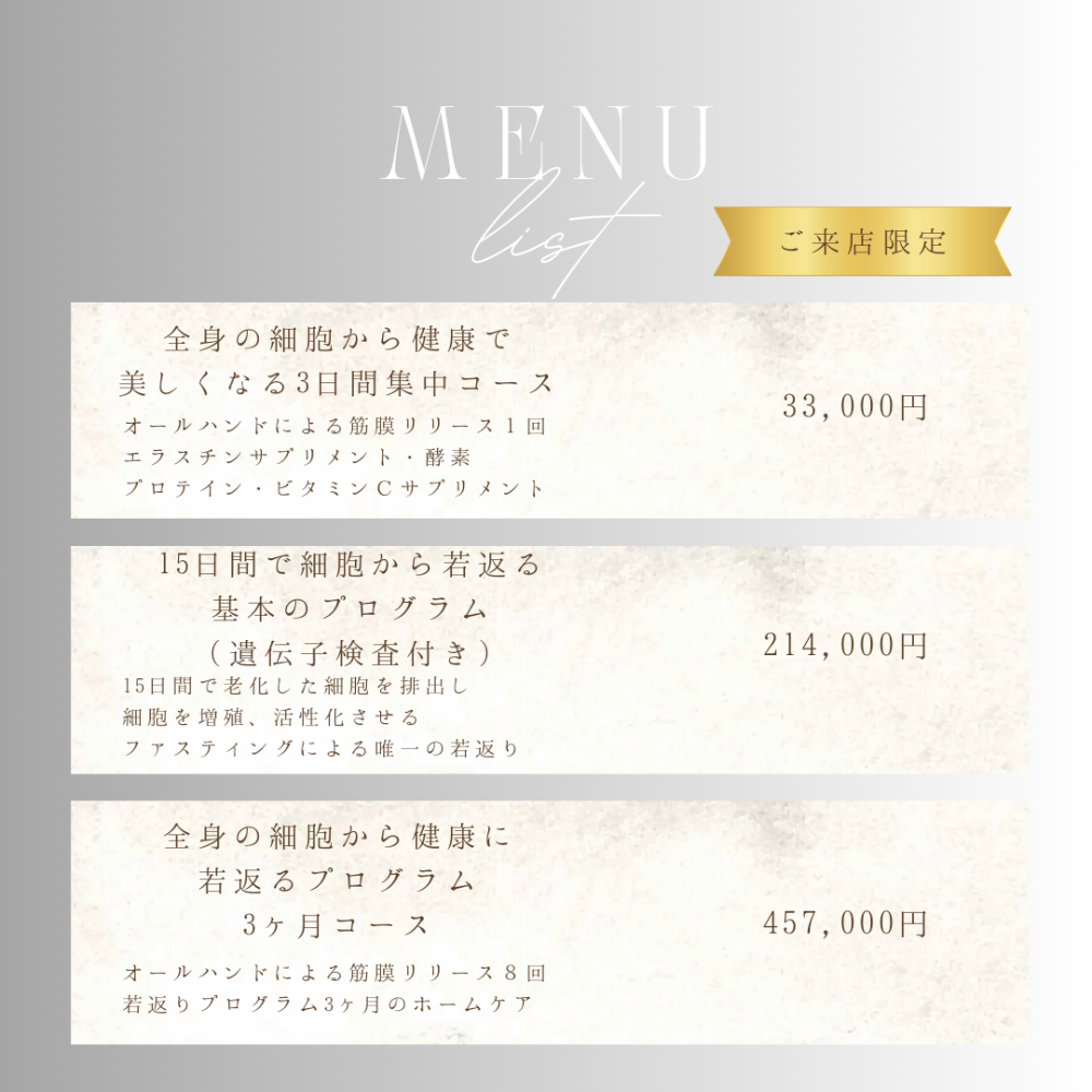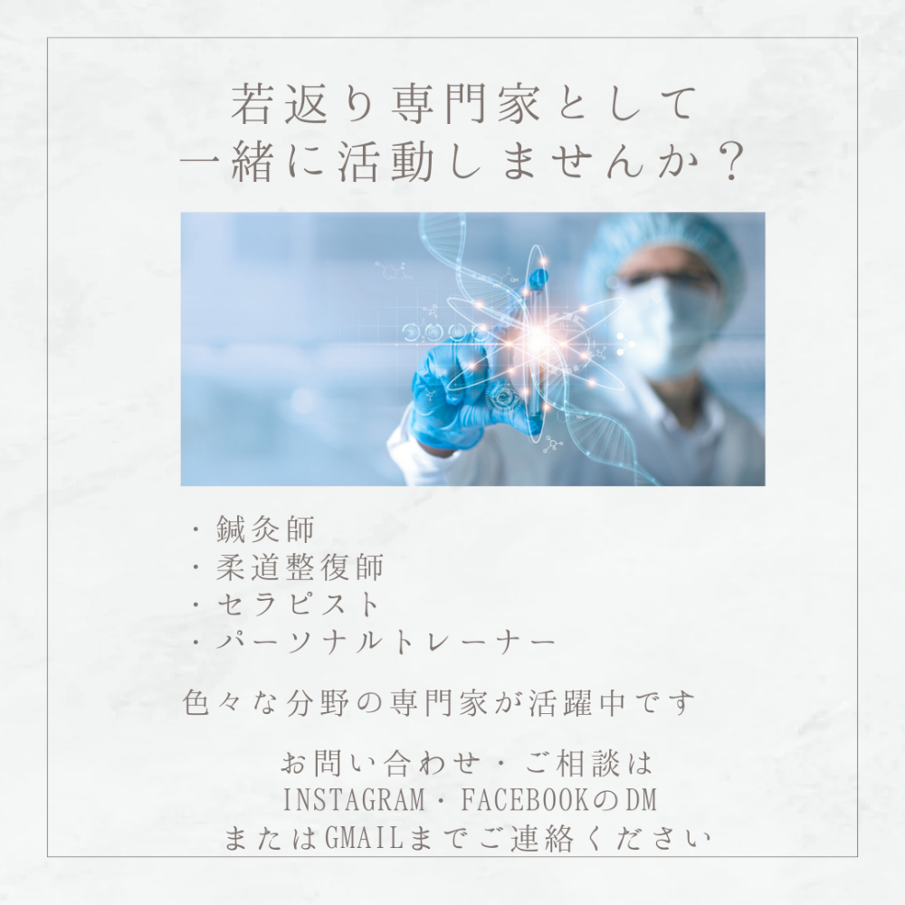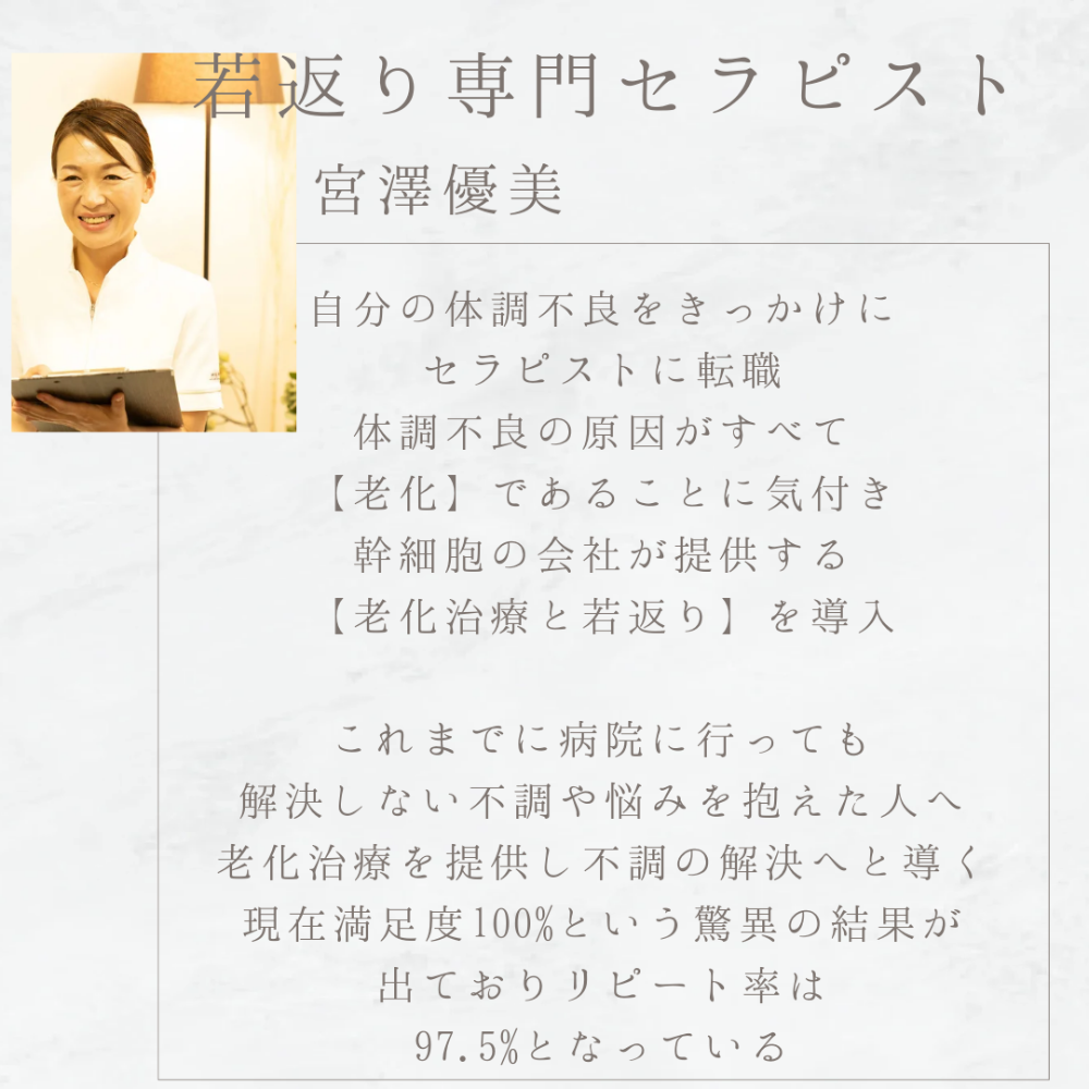 シワも気になる… 最近たるんできた… 疲れもとれなくて朝がつらい… デパコスが映えない サプリメントも効きづらくなった… ダイエットをしても失敗してしまう… どれか1つでもクライアント様が悩んで いらっしゃいませんか? もしあったのならそれは老化によるもの。 老化なら仕方ない… そう思っていたのは過去のこと 今は老化も治療できる時代になりました♡ 実践した方の満足度100% リピート率97.5% 最新の老化治療をしクライアント様の お悩み解決へと導きます