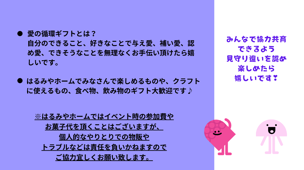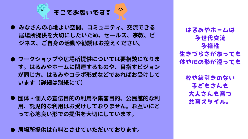 - QïŒåå è²»ãå©çšæã¯ã©ã®ãããããããŸããïŒÂ A.ã¯ãã¿ãããŒã ã§ã¯æã®åŸªç°ã®ããå¶ããšããããªããæŽ»åãããŠããã å©çšåå è²»ã¯ãïŒåã®ãå©çšã«ã€ãã倧人ããïŒïŒïŒåãåã©ãããïŒïŒïŒåãšãããŠããã ããŠãããŸãã â»ã¯ãã¿ãããŒã å èšçœ®ã®ãèå飲ã¿ç©ãåžæã®æã¯ãå¥é€ïŒïŒïŒåÂâ»ã«ãã§ã³ãŒããŒãåžææã«ã¯å¥é€ïŒïŒïŒåã§é£²ã¿æŸé¡ãšãªããŸãÂâ»ã€ãã³ãæã®åå è²»ãäœéšææè²»ã»å¥é€æéãããããŸãããäºæ¿ãã ãããÂâ»æŽ»åæºãšããŠæã®åŸªç°ã®ããå¶ïŒããŒããããŒããšããããŠããŸãã (è©³çŽ°ã¯æã®åŸªç°ïŒããŒããããŒãšã¯ïŒãã芧ãã ãã) åå å©çšè²»ã¯ãã¯ãã¿ãããŒã ã®æŽ»åè³éãšãããŠããã ããŠãããŸãã Q.çºéã«åããç¹æ§ããããŸããéã³ã«è¡ã£ãŠã倧äžå€«ã§ããããïŒÂ A.ãã¡ããã§ãããåæ§ãå®å¿ã§ããããã芪埡ããŸãšäžç·ã«ããŠããã ãå ±æããæ¥œãã¿ãªããéãããŠé ããã°ãšæããŸãããåæ§ãæ £ããŠããããåæ§ã ãã§ããŠããã ããŠã倧äžå€«ã§ãã ã¯ãã¿ãããŒã ãªãªãžãã«ã®ç¹æ§ã·ãŒãã«èšå ¥ããŠããã ããªããå ±æãããŠããã ãå ŽåãããããŸããQ.å絊è 蚌ãæåž³ãæã£ãŠããªããŠãå©çšã§ããŸããïŒèšºæãã»ã³ã¿ãŒãåºåœ¹æéããªããŠãå©çšå¯èœã§ããïŒÂ Aãã¯ããå©çšå¯èœã§ãããæ°è»œã«éã³ã«ããããŠãã ããã ç¹æ§ã®ãããåæ§ã«é¢ããŠã¯ãã¯ãã¿ãããŒã ãªãªãžãã«ã®ç¹æ§ã·ãŒãã«ãèšå ¥ããŠããã ãå ŽåãããããŸãã ãåžææã«ã¯ãå°éæ©é¢ãšã®é£æºããç¹ããããããšãå¯èœã§ãã Q.ç¹æ§ã匷ãã§ãŠããŸããŸããå©çšã¯å¯èœã§ããããïŒéããã®åºŠåãã幎霢ãªã©ã¯å¶éããããŸããïŒA. ç¹ã«å¶éãããããŠãããŸããããåå¥DAYã«æ¥ãŠããã ããšãåæ§ããå®¶æã®æ¹ãã®ãã³ãéãããããšæããŸãã æ§ã ãçžè«ããã ããªãããåãã¹ã¿ã€ã«ãªå Žã®æäŸãã§ããããšæããŸãã Q.HSPåŸåã»ç¹çްãããå Žé¢ç·é»ãªã©ããããéå£ãå€äººæ°ãèŠæã§ãã AïŒéå£ã»å€äººæ°ãèŠæãªå€§äººããåäŸãããå€ã ãããŸãããŸãåå¥ã§æ¥œãã¿ããæ¹ãããããŸãã éããªç©ºéããã£ãã話ãããããçžè«ããããä»ãªã©ããããŸããããåå¥ææ¥æé察å¿ãå¯èœã§ãã ãæ°é£ããªããçžè«ãã ãããæè»ã«å¯Ÿå¿ãããŠããã ãæ¥çšèª¿æŽããããŸãã QïŒåŠæ ¡ã«åã©ããéããŠãŸããã宿é¡ãåŠæ ¡ã®ãå匷ãããããšãå¯èœã§ããããïŒÂ A.ã¯ãã¿ãããŒã ã¯åŠæ ¡ãå®¶åºä»¥å€ã®å± å ŽæãšããŠå°åå°å以å€ã®å± å Žæãšãªã£ãŠãããŸãã åŠæ ¡ä»¥å€ã®åŠã³ã®å Žãè¡ã®ãšãŸãæšã¹ããããããŒã ã¹ã¯ãŒã«ãããã«ãæ²èŒãããŠãããŸããã ç°å¢ããããŠå®¶åºä»¥å€ã®æ°è»œã«ç«ã¡å¯ããå ŽãšããŠãæã«ã¯äŒæ©ããããåŠã³ã®å ŽãšããŠã®ããŒã ã¹ã¯ãŒã«ãã§ããå Žæãæ§ã ãªå¥œå¥å¿ããããäœéšãçºèŠã倧åã«è²ãã§ãããããšæã£ãŠããŸãã å®¶åºåŠç¿èª²é¡ã宿é¡ãªã©ããæã¡ãã ããã Q.ã倧人ã ãã§ãå¯èœã§ããããïŒÂ A.ãã¡ããã§ããã¯ãã¿ãããŒã ã¯å€§äººããã®çããæ¥œãã¿ã倧åãªããŒãã€ã³ããšæããŠããŸãã 倧人ããã ãã§ãããããŠãã ããããå çæ¹ã倧æè¿(ç¬)ð ãã®ä»å°éåéã®æ¹ããã éã³ã«ããŠããã ãã ãã§ãOKã§ãð Q.èŠåŠãã話ãèããŠã¿ãã A.èŠåŠã¯ãåææ§ã ãªæ¹ãããããŠãããŸãã ãåãããŠããŸãã®ã§ããçžè«ãã ããã Q.ããåããã®ãæé·ã®ãæ©ã¿ãå± å Žæãæ¢ããŠããŸãã A.ããæ©ã¿ããæã¡ã®èŠªåŸ¡ããããæ¬äººãšç¹ããããŠããã ãããšã§ãäžäººã§æ±ãããåãæããæã£ã仲éããã¢ãµããŒãã倧åã« å®å¿ããªããæšªã«ç¹ãã£ãŠããïŒç¹ãããªããŠãïŒïŒãããªé¢šã«ã¯ãã¿ãããŒã ããå©çšããã ãããå¬ããã§ãããããŠå± å Žæãã¹ã¯ãŒã«é¢é£ãçŽ æµãªå Žæã¯æ§ã ããããŸãããå®¶åºã®ãèŠæããåæ§ã®èŠæããèãããèŠéãéžæè¢ãåºããããã£ãã«ãªãã°ãšæã£ãŠãããŸãã芪埡ãããšãåããã®ãããã³ã°ãäžç·ã«æ¢ããŠãããŸãããã Q.ãåãããã«å± å Žæãäœããããã©ããã£ããããïŒÂ A.ãããããã®ã±ãŒã¹ã«ããããšæããŸãããMiyaã¡ããã®æ³ããäœéšçµéšãã話ãããããšã¯ã§ããŸãã®ã§ã äžç·ã«ã話ããŸãããâªããžã§ã³ã»ç®çã¯ã掻åãããŠããæ¹ã ã«ãããæ§ã ãªã®ã§ã話ãèãããŠããã ããããšæããŸãã ãããã Q.ãã¯ãŒã¯ã·ã§ãããããã«ã·ã§ã»ã€ãã³ããããŠã¿ãããã©ããã£ããããïŒÂ A.ãã¯ãã¿ãããŒã ã§ã®ã¯ãŒã¯ã·ã§ãããã€ãã³ããå± å ŽææäŸã«ã€ããŠã¯èŠçžè«ã«ãªããŸãã ã¯ãã¿ãããŒã ã«é¢é£ãããã®ãã³ã©ã圢åŒãç®æãç®çãããžã§ã³ãåãã§ããã°ãåãããŠããŸãã å£äœã®å®£äŒç®çã®å©çšãé客ç®çããã ã®å ¬æ°é€šçãªå©çšãèšå çãªå©çšã¯ãåãããŠããŸããã ãäºãã«ãšã£ãŠè¯ã圢ã§ã®æäŸã倧åã«ããŠããŸããå± å ŽææäŸã¯ææãšãããŠããã ããŠãããŸãã 䜿ãã¹ããŒã¹ãå 容ã«ãã£ãŠã§ã¯ãããŸãã ïŒHãïŒïŒïŒïŒåïœïŒïŒïŒïŒå æéãã¹ããŒã¹å Žæãå 容ã«ãã£ãŠ