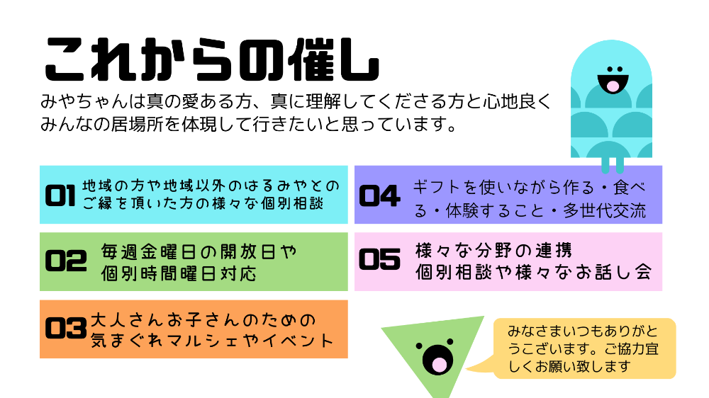 - ãããããããããããããã¿ãã¡ããã¯ãæ§ã ãªç¹æ§ããã©ãã©ãšèŒããŠããã¯ãããã®ããã§ãð€ â¡Âå°åãå°å以å€ã®æ¹ãå¹Žéœ¢åæ ãªã倧人ãåã©ã㮠亀æµã®å± å ŽæäœããããŠããŸãâšä»ãšã¯ã¡ãã£ãšéãæ°ããªã¹ã¿ã€ã«ã«ãŠå± å ŽææäŸå±éäžæã¯èªåã®äºããåŸåãã«ããŠããŠãèªåã®æ°æã¡ãææ ã«èãããŠããŸã£ãŠããŸããããä»ã¯ããã¯ãªããªããæ¥œãã¿ãªããçæŽ»äžããã³ãã¡ã€ãããè±è²æãã¿ãªãããšéã¶ããšãåŠã¶ããšã奜ãããããŠå€§äººã ãããã©ãã ãããããããã¹ããäžè¬åžžèã®ãããªæã®ç€ŸäŒæ§é ã®æŠå¿µã¯ãªããã¿ããªã¿ããªå¯Ÿçãå± å ŽææäŸãããŠããã¿ãã¡ããã¯å®å¿å®å šãªå Žæã§ã¿ããªã®ãããããæ¥œãããã¯ã¯ã¯ã¯ãã¿ããªãããã®ãŸãŸã§ããããå®å¿ãªå Žæããããã¿ããªã§äžç·ã«äœã£ãŠããã®ã倧奜ããªã®ã§ãð æ¬æ¥ã®å§¿ã«æ»ããå ŽæãšããŠã»ã»ã»äžãæã®è²ãŠæãã¿ããªåæ§ãèªããã£ãŠ ã ç¡çããªããååãå ±ã«è²ãŠæããäºããã®ããã§è£ãäžçãðãããããã©ããªåœ¢ã§ãã£ãŠããã©ããªéžæãéžãã ãšããŠãããããªèªåãšã¿ãªããŸã®å¿æŽå£ãæ¬æ¥ã®å§¿ã倧åã«ãâãããŒã·ãã¿ãŒÂâå¿çã«ãŠã³ã»ãªã³ã°Ââäžç»æ ¡èšªåæ¯æŽïŒã«ãŠã³ã»ãªã³ã°âå®¶æçæ³ãèªç¥è¡åÂâçºééããæ¯æŽâçºéå¿çæ€æ»âãªã«ã¿ããã£ãã¹ã¯ãŒã«ã¡ã³ããŒïŒã¹ã¿ããâããŒãæ€ç©ã»ã©ãã¹ãâåžã®ç¹å¥æ¯æŽæè²æ¯æŽå¡è¬åº§ãä¿®äºããÂæ§ã ãªãã©ã³ãã£ã¢ãåŠç¿æ¯æŽãããªãŒã¹ã¯ãŒã«ãããŒã ã¹ã¯ãŒã«ãåæ å¶éã®ãªãå± å Žæäœããªã©ãçµãŠä»ã«è³ãâæšªæµåžå± å Žæè¬æŒäŒãæ§ã ãªã話ãäŒã«ç»å£ã