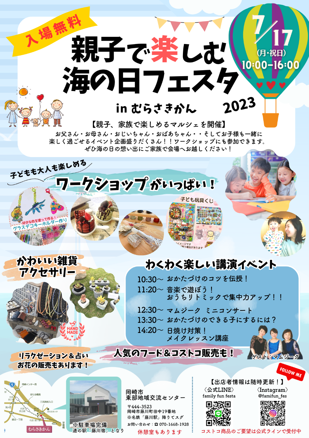たくさんのご来場、ありがとうございました!【日時】2023年7月17日(月・祝)10:00~16:00【場所】岡崎市東部地域交流センター むらさきかん【入場無料】休憩室もご用意しています親子、家族で楽しめるマルシェを開催!お子様が楽しめるワークショップもたくさん!!お父さん・お母さんは美味しいスイーツやリラクゼーションで癒しの時間を。わくわく楽しい講演イベントも予定しています!ぜひ、海の日フェスタへお越しください。