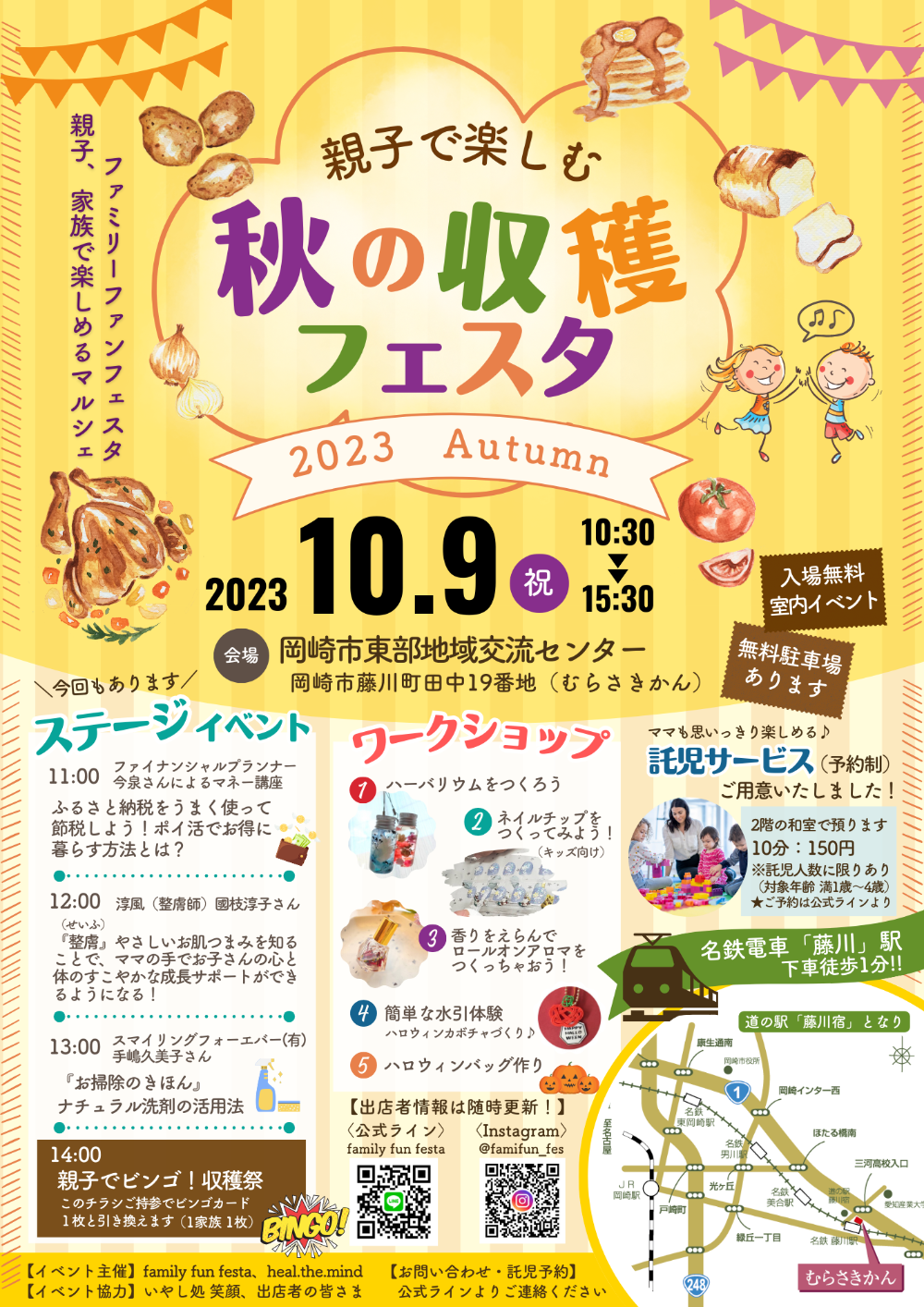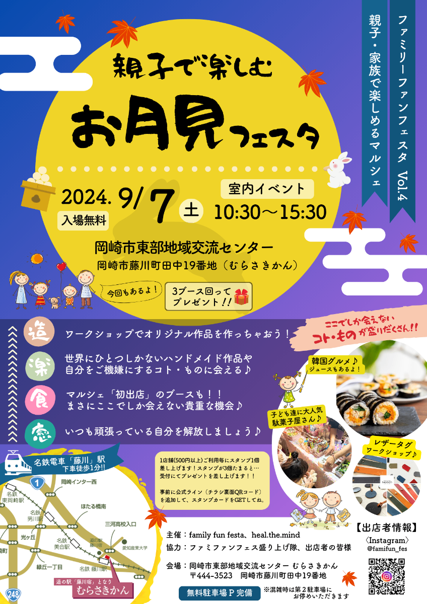 たくさんのご来場、ありがとうございました!【日時】2023年10月9日(月・祝)10:30~15:30【場所】岡崎市東部地域交流センター むらさきかん【入場無料】今回は託児サービス(予約制)もあります親子、家族で楽しめるマルシェを開催!お子様が楽しめるワークショップもたくさん!!お父さん・お母さんは美味しいスイーツやリラクゼーションで癒しの時間を。わくわく楽しい講演イベントも予定しています!ぜひ、秋の収穫フェスタへお越しください。