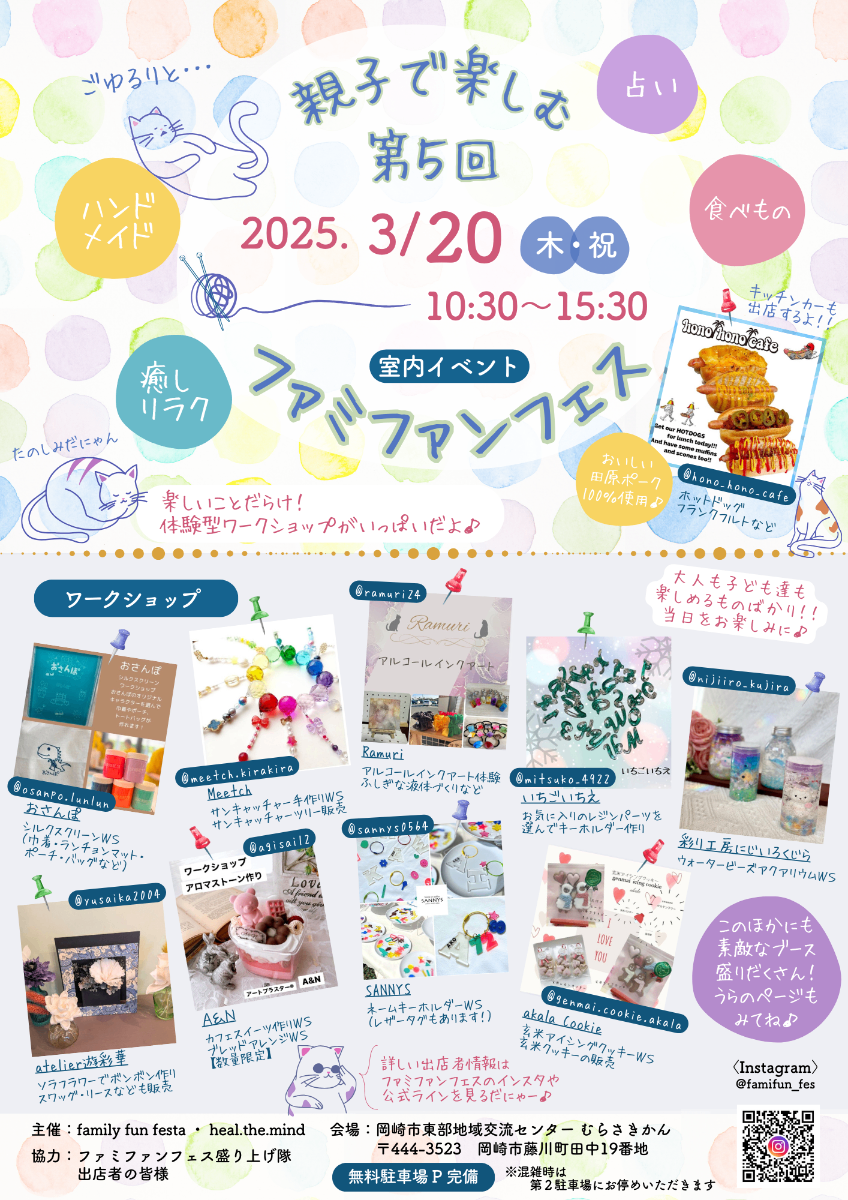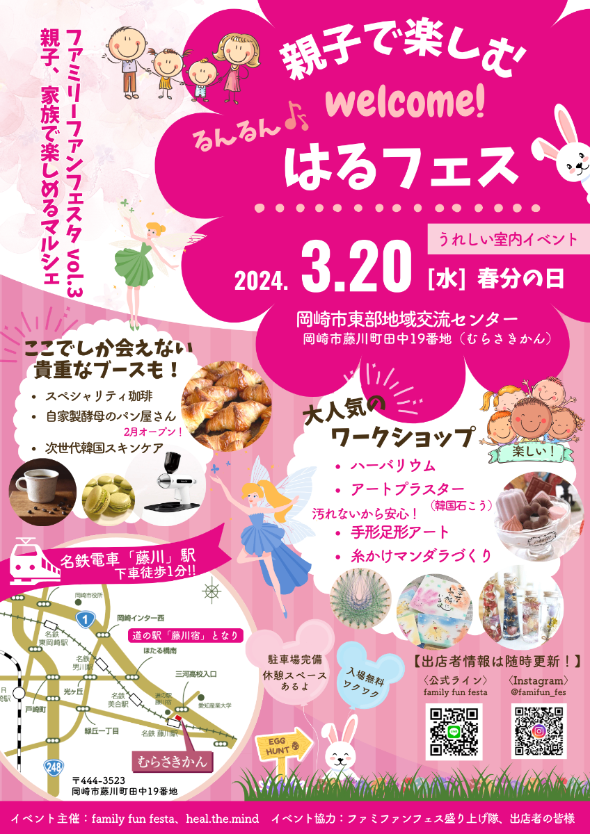たくさんのご来場、ありがとうございました!【日時】2024年3月20日(水・祝)10:30~15:30【場所】岡崎市東部地域交流センター むらさきかん【入場無料】室内イベント・駐車場完備ママもパパも、子どもたちも!家族でまるっと楽しめるマルシェを開催!!楽しいワークショップも盛りだくさんです。お父さん・お母さんは美味しいスイーツやリラクゼーションで癒されてくださいね♪ぜひ、ウキウキ&ワクワクの「はるフェス」へご家族揃ってお越しください。