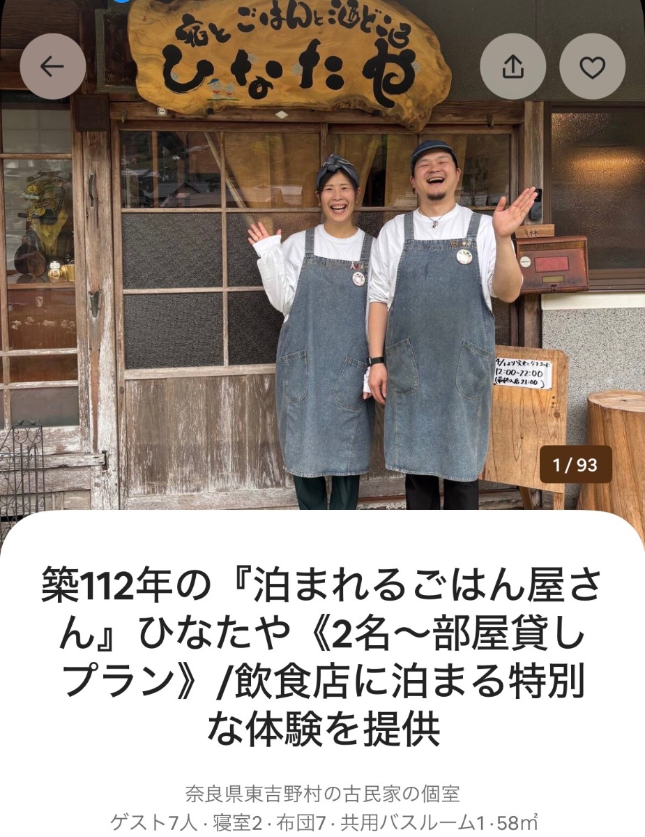 まずはリンクを開いてくださってありがとうございます!気軽にニックネームで呼んでくださいね🤩🎶私たちは大阪から1時間半で行ける秘境奈良県・吉野地方にある東吉野村で築100年超えのおばあちゃんちを夫婦で再生し《泊まれるごはん屋さん》を営んでいます👩❤️👨山と川に囲まれ空気と星空のキレイなこの村で古民家の縁側でひなたぼっこしたり美味しいごはんとお酒で笑顔になれる🍻ひなたのようにぽかぽかとあたたかい場所作りを目指して夢に向かって 日々、奮闘中💪たくさんの応援のおかげさまで2025年4月4日ついに《泊まれるごはん屋さん》をグランドOPENしました!「全て楽しむ!」をモットーに!!大好きなおばあちゃんちをつなぎ再び笑顔が集まる場所になるようにマイペースに活動しています🥳✨SNSでは◎東吉野に行った気持ちになれる景色◎築111年の古民家が宿になるまでのリアルなストーリー◎その時々に感じた想いをお届けしています🌲🌳🌲フォローや応援が力になっています🙏💞どうぞ力を貸してください🥰よろしくお願いします👵🏻