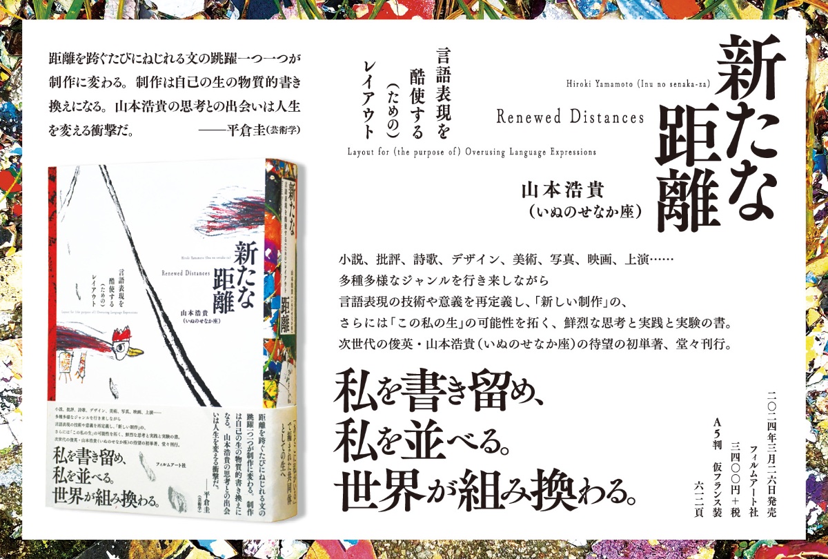 2024年にはこれまでの批評をまとめた単著3部作のうちの1冊目『新たな距離――言語表現を酷使する(ための)レイアウト』(フィルムアート社)を刊行。推薦は平倉圭(「山本浩貴の思考との出会いは人生を変える衝撃だ」)。