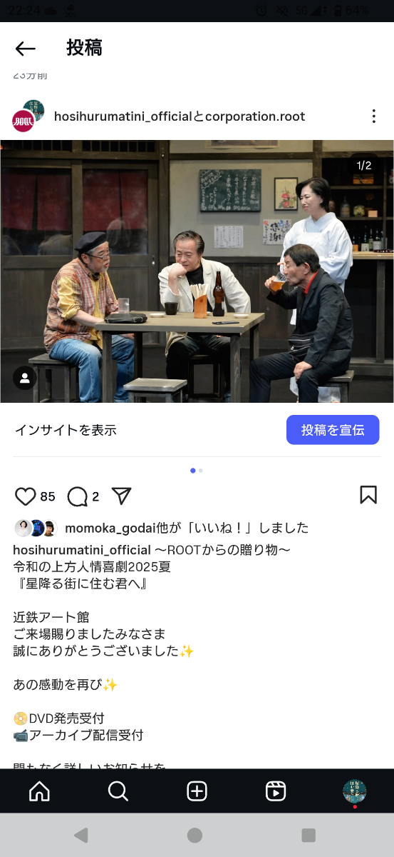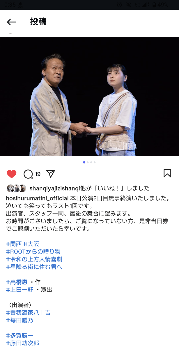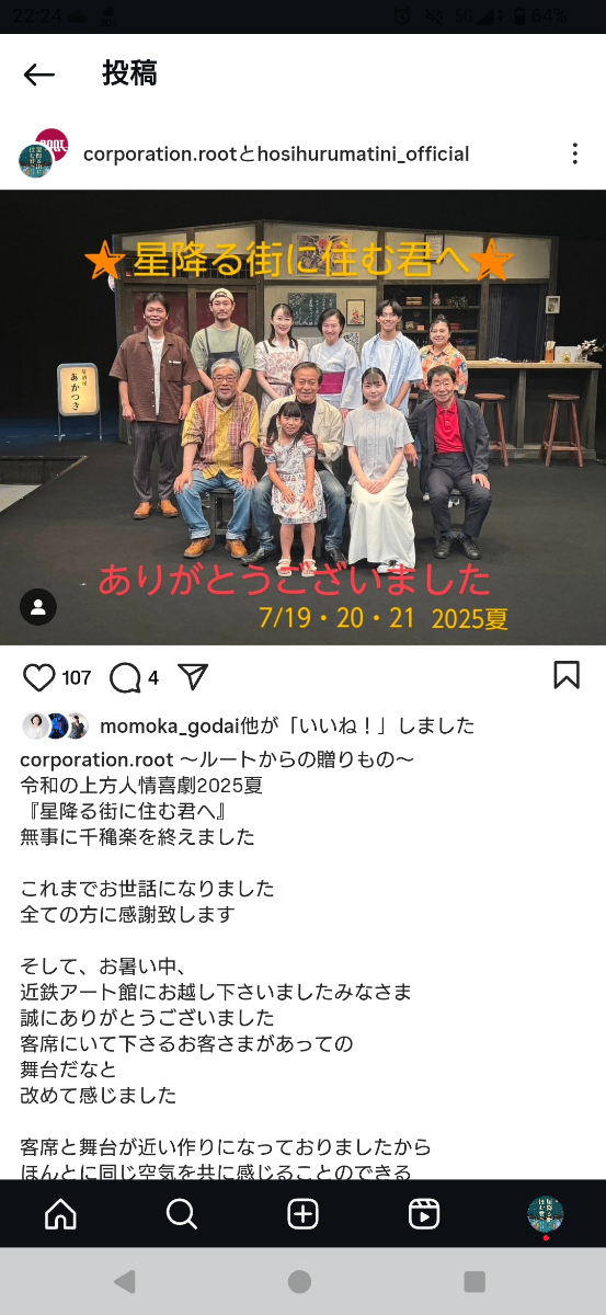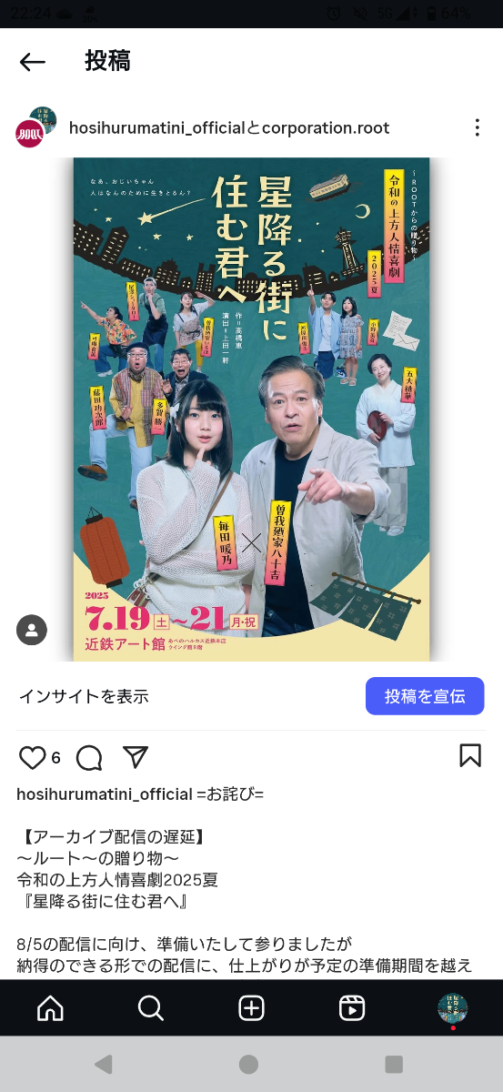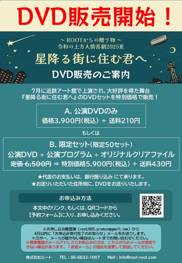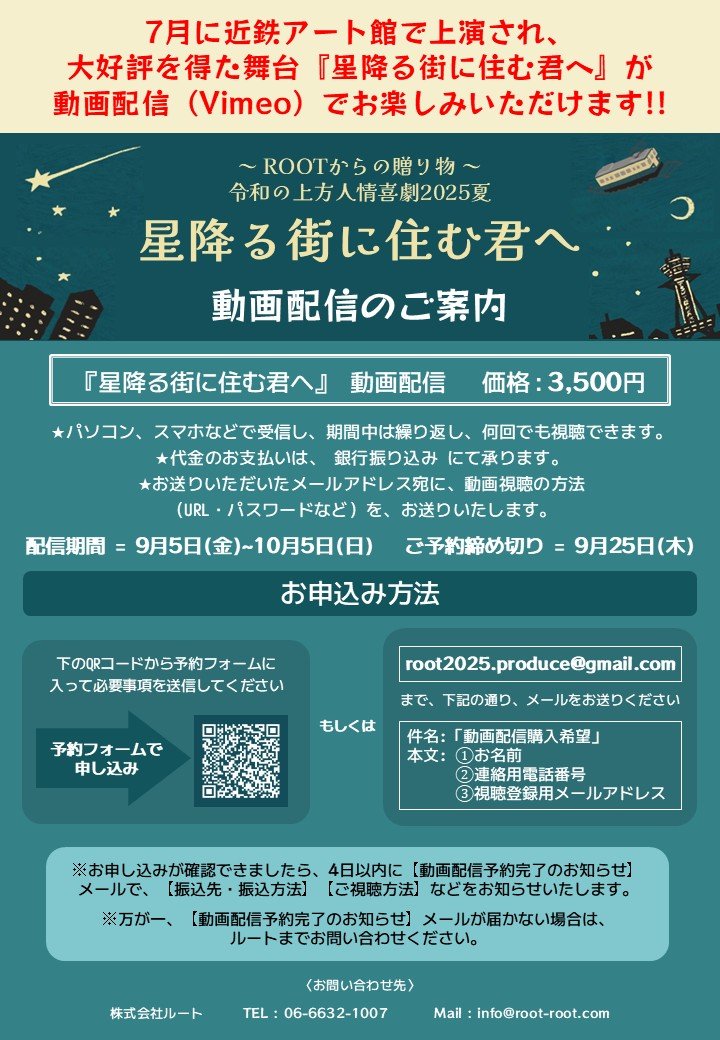 〜ROOTからの贈り物〜 令和の上方人情喜劇2025夏🌻 『星降る街に住む君へ』 大阪の夏、近鉄アート館にて上演🌠 時代は令和 今や、キャッシュレス化・ペーパーレス化、あらゆるAI化が目まぐるしく進む現代… どんなにデジタル 化が進もうと、いつの世にも人情はある… 最年長81歳から、最年少7歳の世代ギャップ✨ そこにも心の通い合う会話はある‼️ 近鉄アート館から生まれる令和の人情喜劇🌼 心込めてお送りいたします 是非ご覧くださいませ✨ 劇 場 近鉄アート館 上演日 7月19日(土) 13:00/17:00 7月20日(日) 13:00/17:00 7月21日(月・祝) 13:00