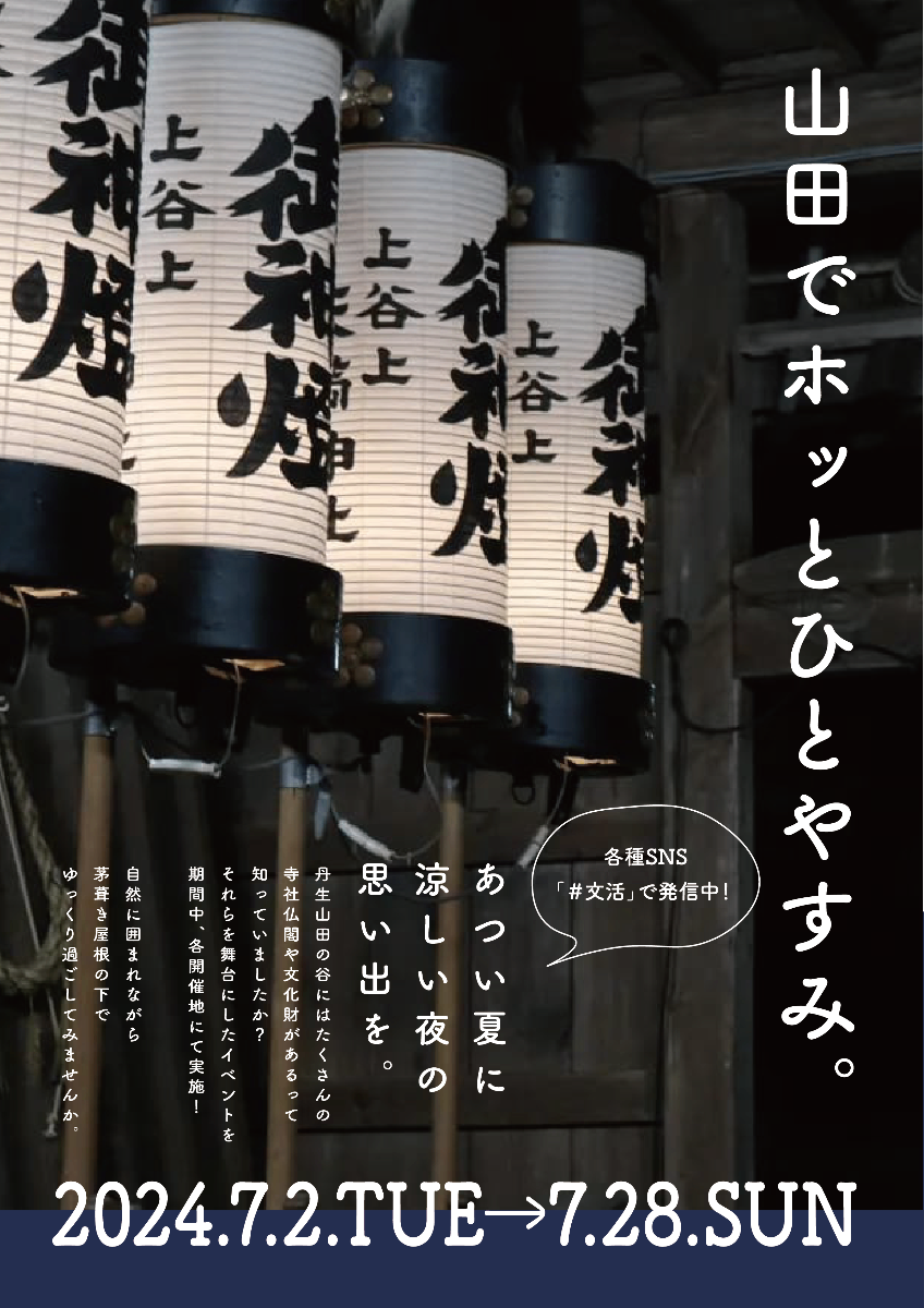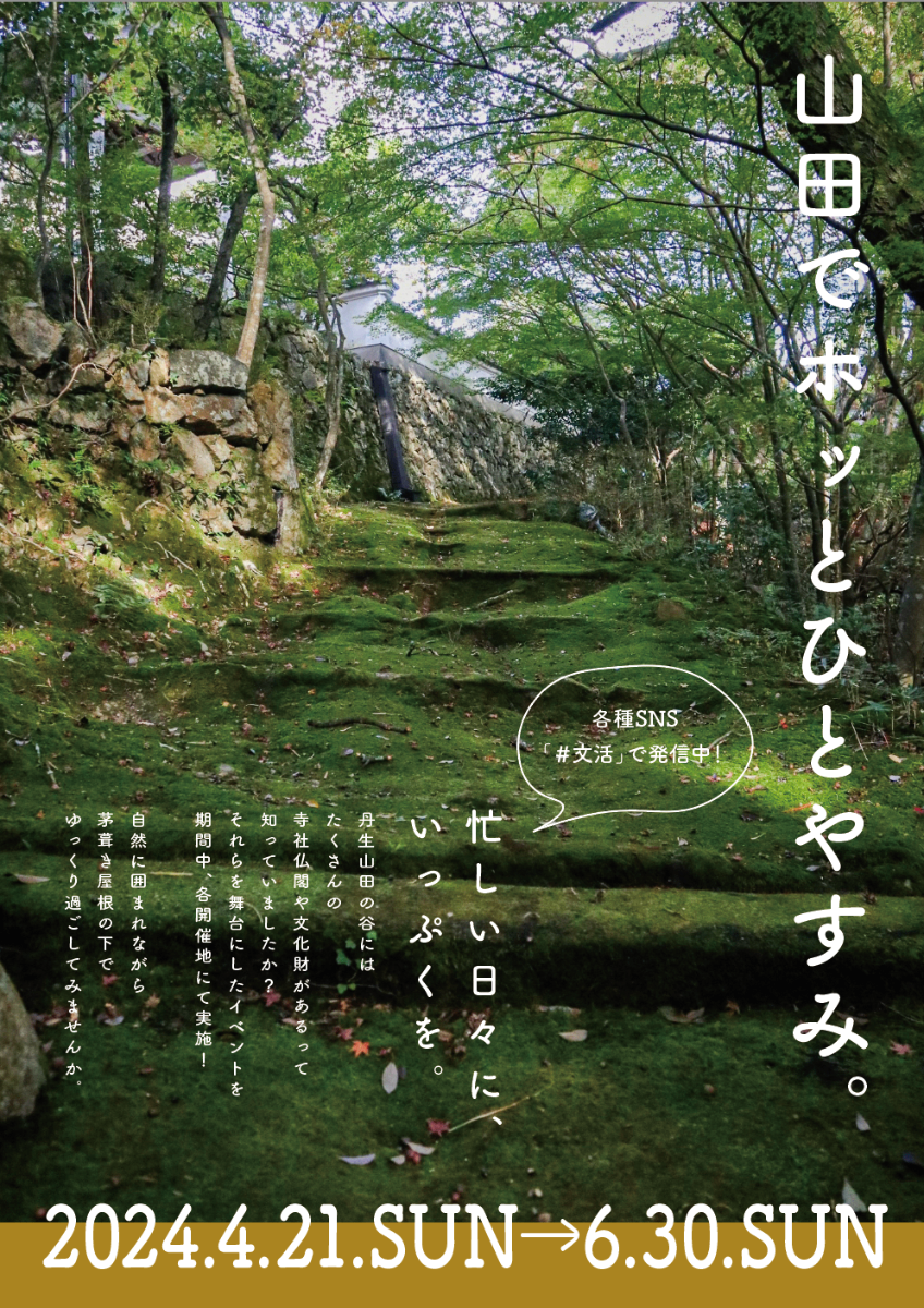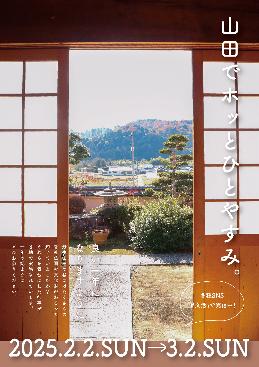 忙しい日々に、一服を。 丹生山田の谷にはたくさんの寺社仏閣や文化財があるって知っていましたか? それらを舞台にしたイベントを期間中、各開催地にて実施! 自然に囲まれながら茅葺き屋根の下でゆっくり過ごしてみませんか。