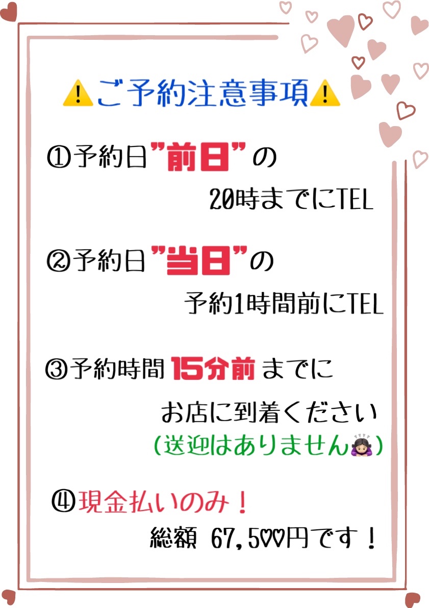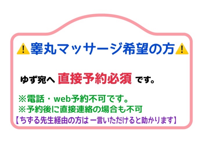 初めましての方も、ゆず宛へご予約が嬉しいです◎ ※LINEを追加された方は、連絡を待たずに【下記予約内容】をお願いします ⚠️不備があると予約が取れません (当日のご予約は確認ができませんのでご了承ください) 【予約時必要事項 / Reservation form】 ※コピーしてね※ ①名前(苗字、ひらがな ※偽名可能) ②日時( 11:00 / 13:30 / 16:00 / 18:30 ) ※複数希望があるとスムーズです ③電話番号 ④過去来店履歴 ⑤姫予約の衣装希望(数字で) ⑥睾丸マッサージ希望有無
