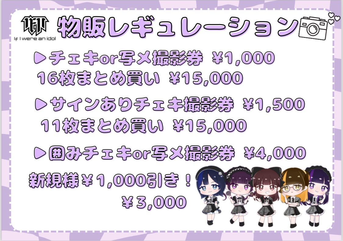 【ポイント特典内容】 (毎カードにあるプチ特典)・10pt→サインありチェキ撮影券1枚 or 囲み写メ1枚・20pt→お好きなメンバー15秒動画 or 囲み15秒動画・30pt→お好きなメンバーのオリジナル自撮りメッセージ画像1枚・35pt→宿題チェキ1枚【カード達成特典内容】 (カードコンプリートごとに受けられるスペシャル特典)・1枚→お好きなメンバーと現場特典会にてトーク5分 or オンライントーク5分&宿題チェキ1枚&オリジナル自撮りメッセージ画像1枚・2枚→お好きなメンバー15秒動画&囲み動画15秒&全メンバーサインつき!IFIIロゴTシャツ(メンカラ5色+黒or白の全7種からお選びできます)&お好きなメンバーの直筆メッセージ入り!撮りおろしオリジナルポストカードお渡し・3枚→宿題チェキ1枚&お好きなメンバー30秒動画&お手紙&プリ同(運営同行)&お好きなメンバーのサイン入り私物1つお渡し・4枚→限定オフラインイベントご招待(運営同行)&全メンバー直筆スペシャル色紙お渡し・5枚→お手紙&君だけライブ開催(当日セットリスト決定権あり&フル撮影OK)&お好きなメンバーとプリ同付き1時間屋外デート(運営同行)【ポイント付与の仕組み・基本ルール】①動員ポイント ライブ来場&対バンの際IFII動員で+1ポイント。★動員重要ライブ等ではポイント加算キャンペーンも実施予定。(時前に告知いたします!)②物販ポイント 物販にてお会計1000円ごとに+1ポイント。★「サインありチェキまとめ買い」に関しては1セットにつき計16ポイント付与!(+15ポイントに加えてさらに+1ポイントを付与いたします。)例1:撮影券2枚+サインありチェキ撮影券1枚=3,500円→+3ポイント例2:撮影券3枚+サインありチェキ撮影券まとめ買い1セット=18,000円→+18ポイント+1ポイント 計19ポイント【ルール・注意事項など】※使用に関しては通過制となります。※カードはお客様ご自身で保管をよろしくお願いいたします。※紛失等のトラブルに関しては一切責任を負いかねますので予めご了承ください。※ポイントカードの転売・譲渡等は原則禁止とします。※ポイントカード運用や特典内容に関して、改正等を行う場合がございますので予めご了承ください。※その他、ご不明点等ございましたら公式Xや物販受付にてお気軽にご相談ください。