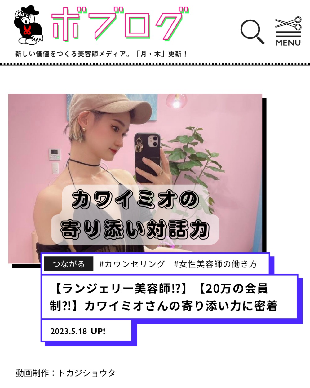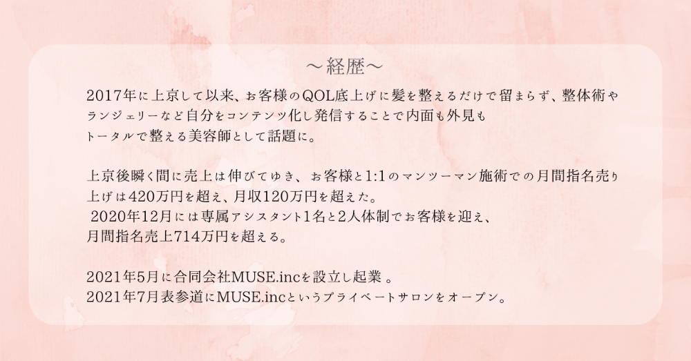 お客様のトータルビューティーのサポートをメインに掲げ、小顔ケア・整体マッサージ・マインドケア・髪質改善・ヘアスタイル・ランジェリー・ファッションなど、 内面から外見までお客様のあらゆる悩みを全身全霊、 心から寄り添い解消するという、 前代未聞の美容師として13年間活躍。20代で最高月間指名売り上げは専属アシスタント1名で 今となっては伝説の714万円、 完全マンツーマン(アシスタントを付けず お客様とカワイミオの1:1)接客施術での 最高月間指名売り上げは420万円を超える という前代未聞の記録を残し、女性として、一美容師としても、 さまざまなメディアから注目され話題に。取材やコラムの執筆依頼も多数受ける。2021年、表参道にて独立開業。2年間トータルビューティーサロンMUSE.incを 経営しつつ、施術者としても活動しながら、 ランジェリーやヘアケアブランドからのオファーを受け、コラボ製作を果たす。中でも髪質改善サロンやヘアケアに特化した美容師からも 絶大な支持を受ける髪質改善ストレートアイロン radiantとのコラボレーション“forMUSE”は、 デザインの可愛さとスペックの高さが話題となり、製作元の株式会社B-next公式販売サイト以外にも、 ヨドバシカメラやビックカメラなどの 大手家電量販店から注文が殺到し、 全国で絶賛好評発売中。タレントやモデル、美容系インフルエンサーをはじめ、 美意識や感度の高い方たちから 絶大な人気と信頼を集めている。30歳になり心身の疲労が祟り、腰痛と鬱を経験後、2023年5月末、美容師の施術者としては引退を決める。Amazonのほしいものリスト
