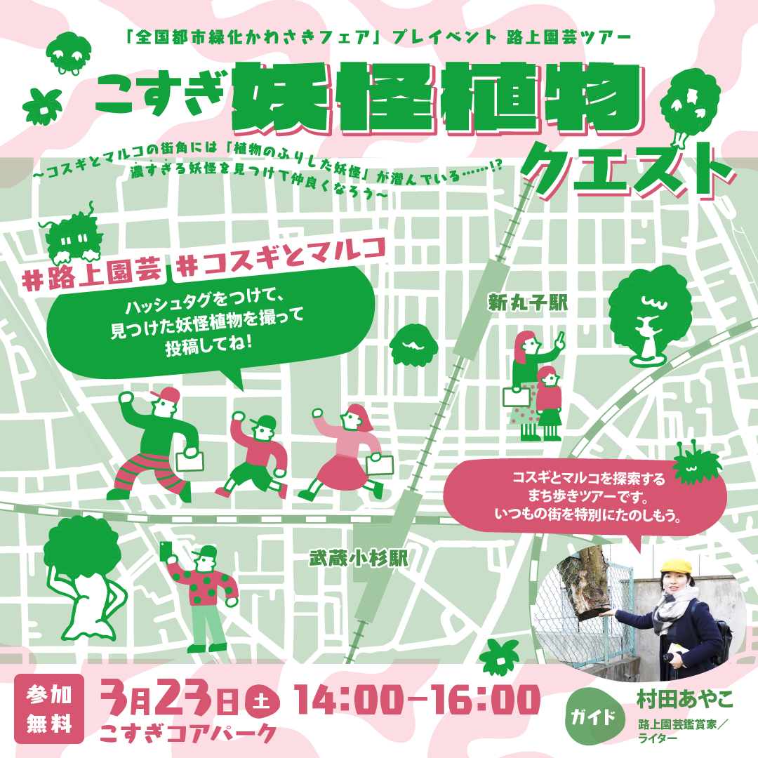 路上園芸鑑賞家の村田あやこさんをガイドに、コスギとマルコを探索するまち歩きツアーです。