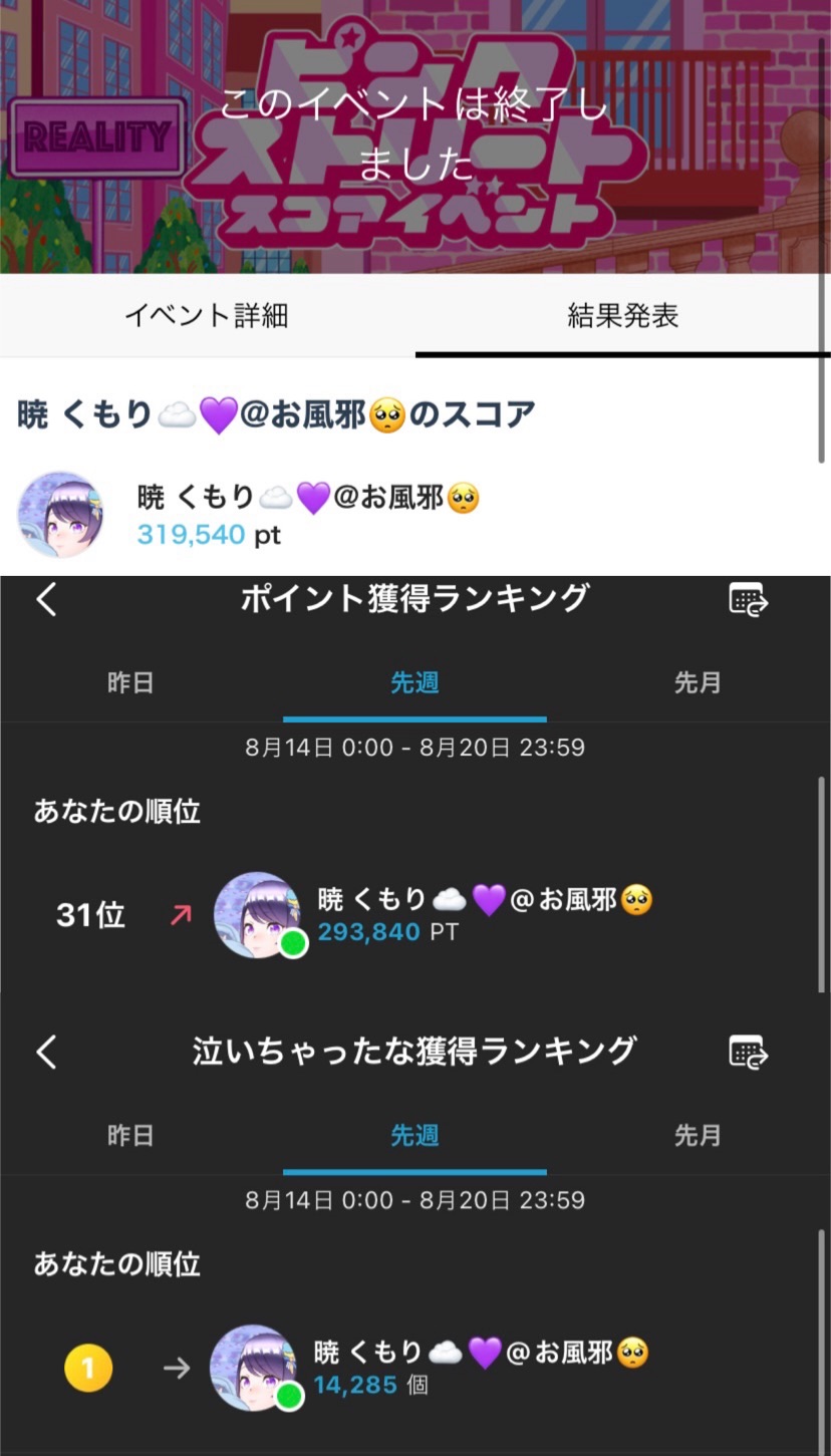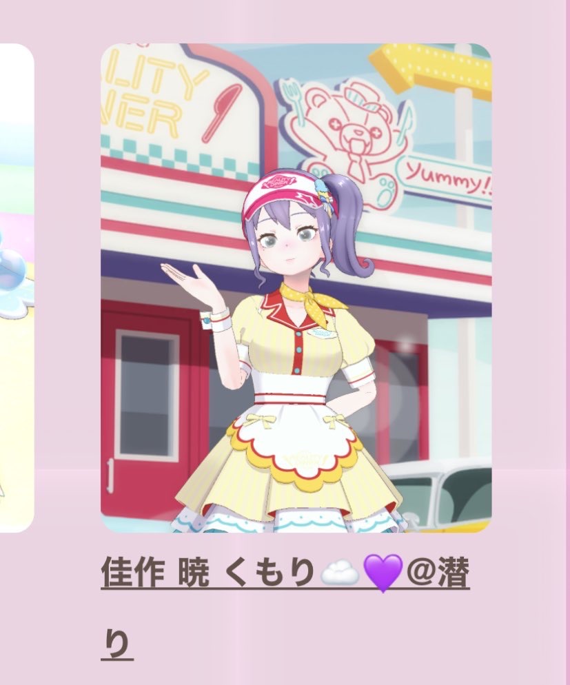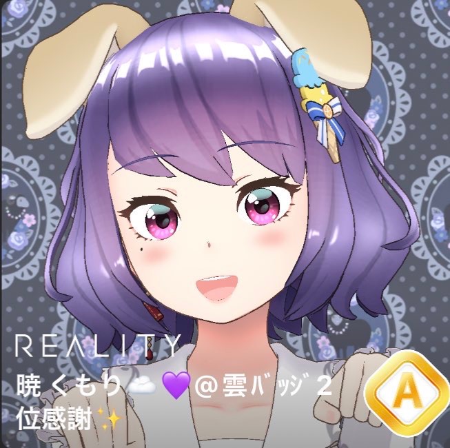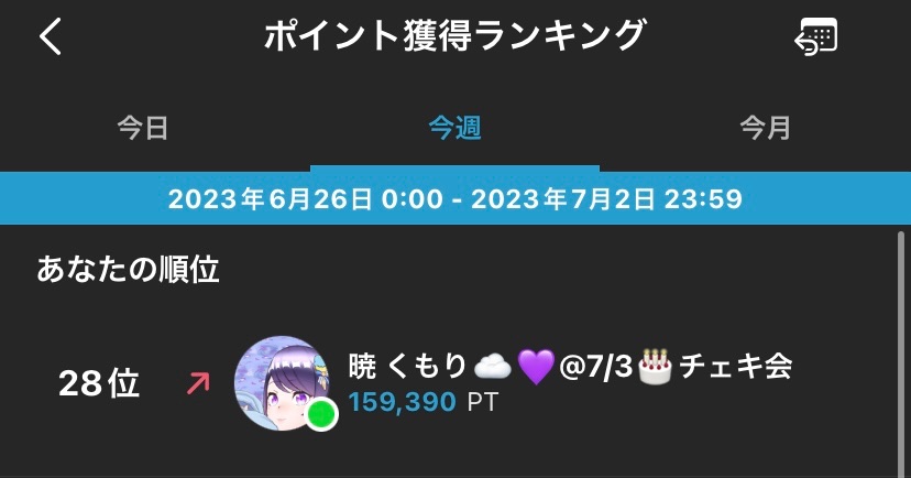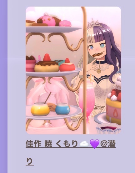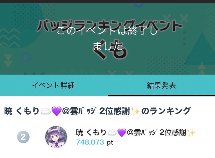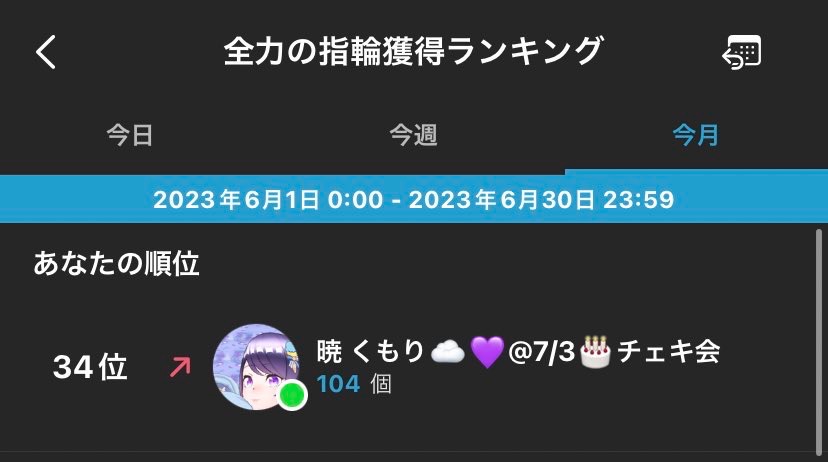- 2022.07.19 初配信2022.07.20 フォロワー50人突破初ガチャチケ(マト先輩)2022.07.25 フォロワー100人突破2022.08.01 フォロワー150人突破初全力の指輪(mihotoさん)2022.08.06 フォロワー200人突破2022.08.19 1ヶ月記念飲み会配信(初凸チェキ会)2022.08.23 フォロワー300人突破2022.09.01 初タワー(しょーさん)初注目1位2022.09.03 「全力の指輪」50個突破2022.09.04 くもバッジイベント2位🥈「わたぐも」フォロワー400人突破2022.10.24 千葉ポスター応援ランキング3位名前掲載2022.11.10 スカイランタン壁紙獲得2022.11.19 フォロワー500人突破2023.01.15 フォロワー600人突破2023.01.24 フォロワー700人突破「全力の指輪」100個突破2023.02.11 フォロワー800人突破バレンタイン壁紙獲得2023.03.16 フォロワー900人突破2023.04.13 フォロワー1000人突破2023.04.27 フォロワー1100人突破2023.06.10 ダイナー壁紙獲得2023.06.27 七夕&花火壁紙獲得(🅿️だけで15万)2023.06.30 「全力の指輪」月間104個達成2023.07.15 フォロワー1200人突破2023.08.15 ピンクストリート&アイス壁紙獲得(🅿️だけで15万)2023.09.10 フォロワー1300人突破2024.01.22 毎日配信終了(記録:550日)2024.02.26 「全力の指輪」300個達成(無料pt終了)2024.06.01 フォロワー1400人突破2024.07.03 アニマニ壁紙(最終特典まで)獲得2024.07.21 フォロワー1500人突破2024.08.02 中華御殿壁紙獲得2024.08.23 フォロワー1600人突破2024.08.24 ガーコ壁紙獲得(Bまで)2024.09.02 ファンタグ「#くもりの愛犬」に決定2024.09.28 フォロワー1700人突破2024.10.26 フォロワー1800人突破2025.05.22 フォロワー1900人突破2025.05.27 アバターフィード#おやすみコーデ 「夢の中」佳作2025.06.22 アバターフィード#染色チャレンジ「ライトイエロー」佳作2025.07.03 七夕壁紙獲得(Bまで)