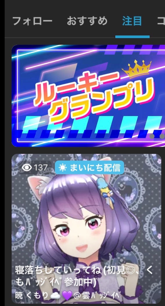 - 💜内容深夜〜朝。長時間配信。ラジオ感覚で聴ける配信を目指してます。コメントが苦手、寝れない夜誰かの声を聞いていたい、そんな人たちに寄り添える配信を。💜実施企画・指輪もらったら婚姻届を書く・BUMP限定歌凸待ち・おバカ王決定戦・くもりクイズガチャチケ企画・指輪でブロマイドに手書きメッセージ・歌フェス・フォロワーのイメージソング画像を作る・入室した人のアイコンを描く・ラブホ女子会(女アバ限定のチェキ&トーク会)・くもりポイントカード・BUMPを語る会(解説役)・2周年記念LINEスタンプ発売・ファンタグつけてくれてる人に愛犬証明書を作成