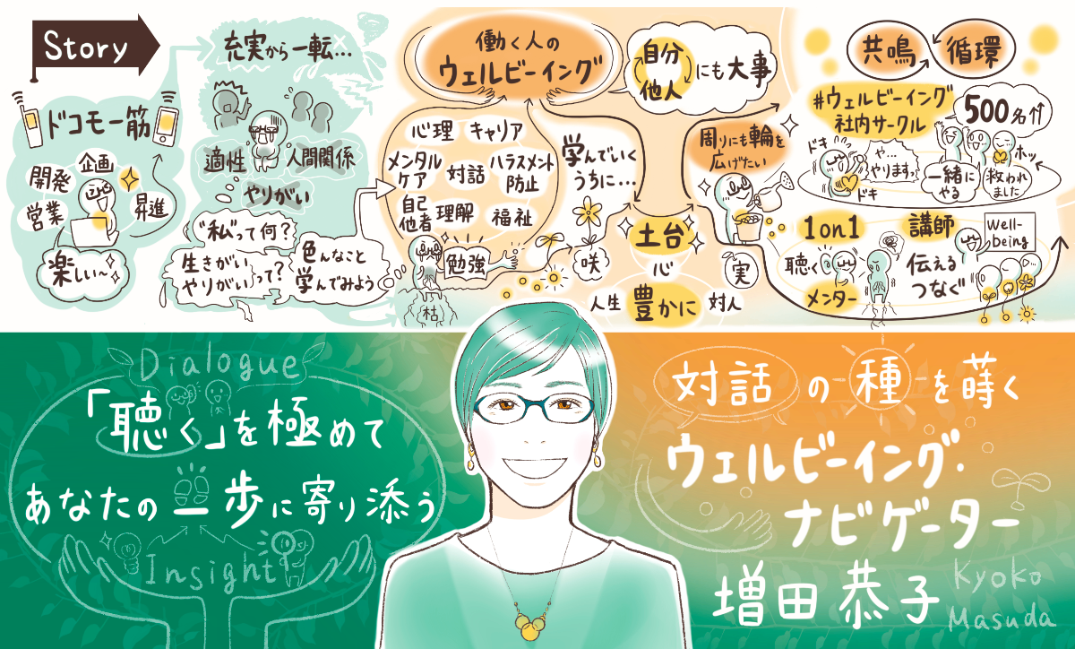 ---------------------------------------------------------はじめまして。増田恭子と申します。NTTドコモに新卒で入社し、かれこれ24年目になります。仕事大好き・ドコモ大好きで、キャリアに邁進する充実した社会人生活を送っていました。そんな私でしたが――あるとき仕事や人間関係で立ち直れないほどに思い悩む時期を経験し、見える世界が一変しました。それは当時の私にとってこれまでの価値観を覆すような辛い経験となりましたが、同時に大きな気づきと学びのきっかけにもなり、自分の人生を大きく変容させる転機にもなりました。悩む日々の中で自己対話を繰り返し、自分自身の心やキャリアと深く向き合う中で、メンタルヘルスやカウンセリング・自己理解・キャリアなど幅広い分野の知識を学びました。そうして動いていくうちに「ウェルビーイング」の概念とも巡り合い、社内外で学びを発信していくうちに賛同する仲間が集まっていきました。その輪が広がっていく中で、社内サークルとして管理職のための【all-managers-wellbeing】、全社員対象の【ウェルビーイング推進室】を発足。all-managers-wellbeingには約200名、ウェルビーイング推進室には約500名を超える参加者が集まり、メンバー同士が相互に発信し、共鳴し、つながり、学びが循環するエンパワーメントサークルへと成長しています。そこから活動の枠が広がり、社内外からお声かけいただき講師やファシリテーターとしてさまざまセミナー・ワークショップを開催。また、社外でキャリアに悩む管理職や若手女性の1on1カウンセリング、大学のウェルビーイング学部社会人サポーターなども行っています。---------------------------------------------------------かつて人間関係やキャリアに悩んでいた私は、今では同じように悩める個人に寄り添い、自己対話や気づき・その先にある自己変容を促すナビゲーターとして活動しています。心に蒔かれた種が芽吹き、関わった人たちの未来が花開いていくとき、私自身もまた大きな喜びを受け取っています。身体的・精神的・社会的に良好な状態を表す【Well-Being】――その捉え方は人によって違うと思います。「個」の幸せが深まり個人が輝いていくこと、そこから相互に良好な「人間関係」や、よりよい「組織」「社会」づくりへと輪が広がっていくこと――私が目指すウェルビーイングは、そんなエンパワーメントが循環する世界を仲間と共に紡いでいくことです。キャリアや人間関係で悩んでいる方、ウェルビーイング活動に興味のある方はぜひお声かけください。あなたの奥にある「声」を聴き、あなたの得意や可能性を広げるお手伝いをします。仕事・活動