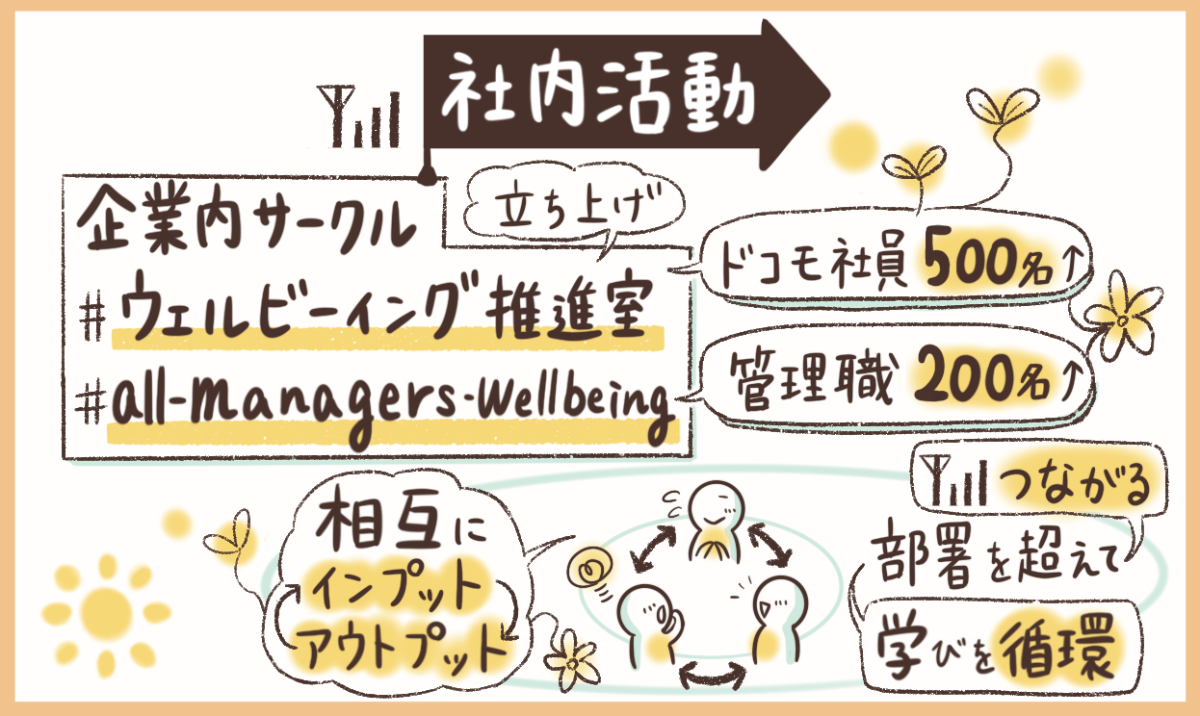 - ▼「ウェルビーイング推進室」とは---------------------------------------------------------∟NTTドコモ公認・ドコモ全社員を対象とした企業内サークルです。部署や役職の枠を超えて社員同士がつながり、個々のWell-being(幸せな働き方)の実現につながるヒントやきっかけづくりから、よりよい組織づくりへの循環を目指しています。オンライン・オフラインの交流会をはじめ、ウェルビーイングや対話、自己理解/他者理解などをテーマにした講義・ワークショップなども多数開催。運営からの発信だけではなく、メンバーからのアウトプットや企画なども生まれ、相互にインプット・アウトプットを通して社員同士の新たなつながりやエンパワーメントの輪が広がっています。参加者約500名超。