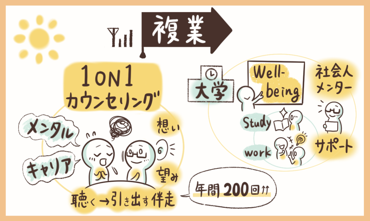 - ◇エール社|社外人材によるオンライン1on1サービス「YeLL」∟サポーターとして1on1を実施―――――――――――――――◇ベネッセ社|女性キャリアサポートサービス「withbatons」∟社外メンターとして1on1を実施―――――――――――――――(※年間200回以上の1on1カウンセリングを行っています)---------------------------------------------------------◇武蔵野大学|ウェルビーイング学部∟社会人メンターとして対話の授業のサポートなどを実施―――――――――――――――◇Well-reading ブックコーチ∟対話をベースに、心や生活が豊かになる選書をサポート