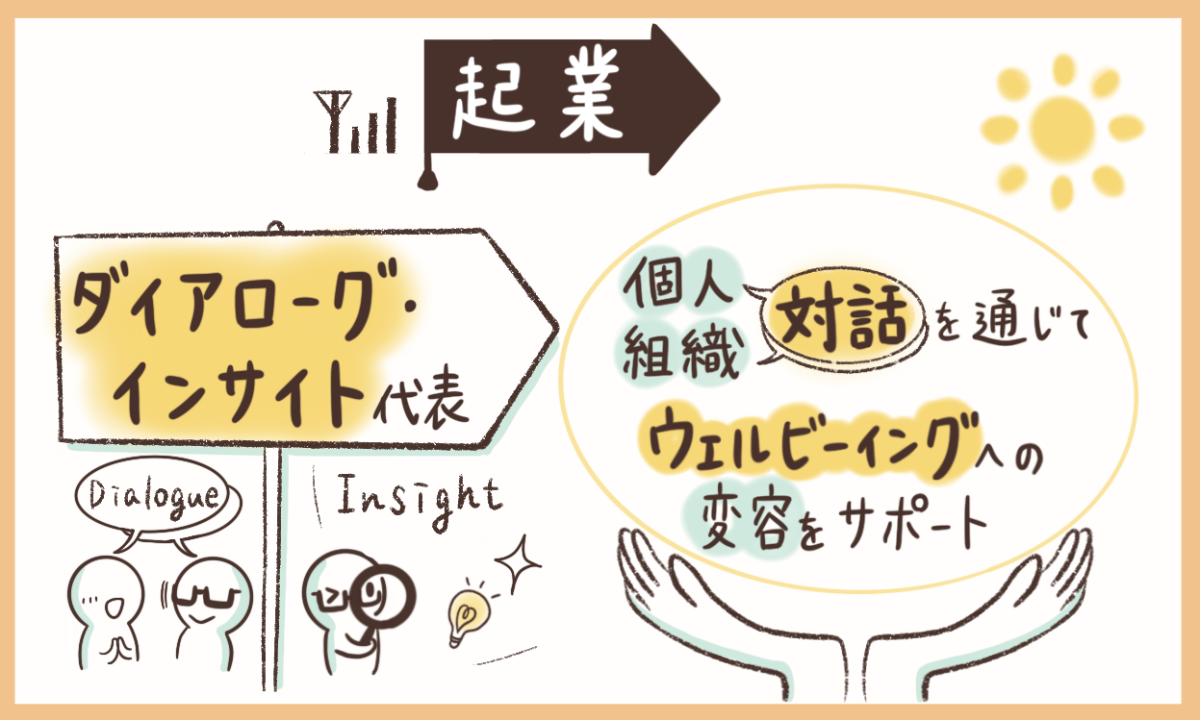 - 屋号 ▶ ダイアローグ・インサイトミッション ▶ 「聴く」を極めてあなたの一歩に寄り添う社内外の活動・複業の幅が広がる中で2025年3月、個人事業主として開業しました。ダイアローグは「会話」や「対話」インサイトは「分析」や「自己理解」個人や組織との対話を通じて、ウェルビーイングに変容していくことを支援します。キャリアコンサルタントをメインに、ご要望に応じて、ワークショップ、組織開発コンサルにも対応いたします。