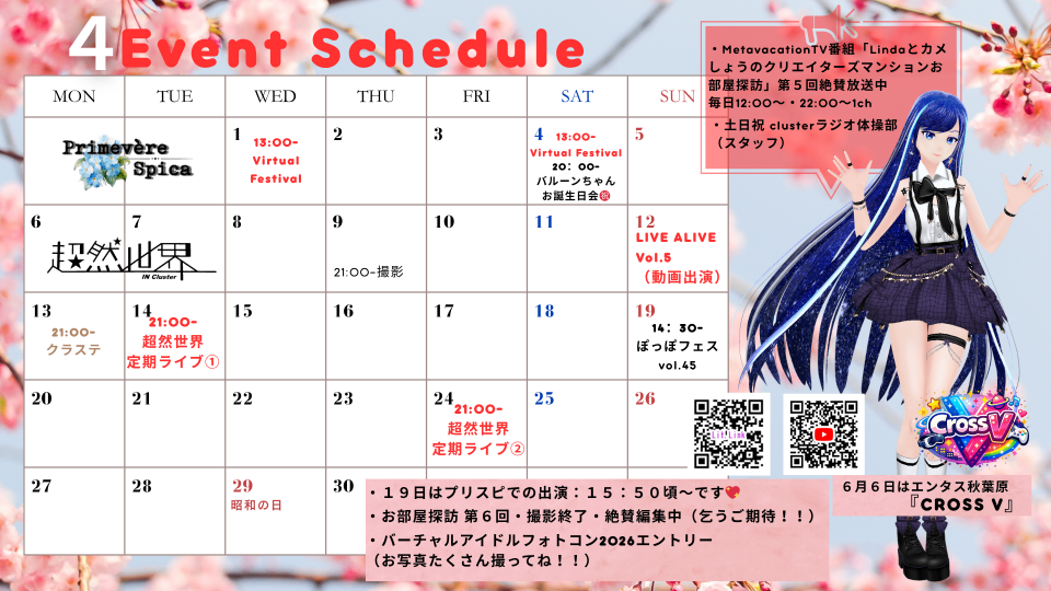 メタバースプラットホーム「cluster」内テレビ「MetavacationTV」で絶賛放送中・毎日正午~・22:00~Lindaとカメしょうのクリエイターズマンションお部屋探訪